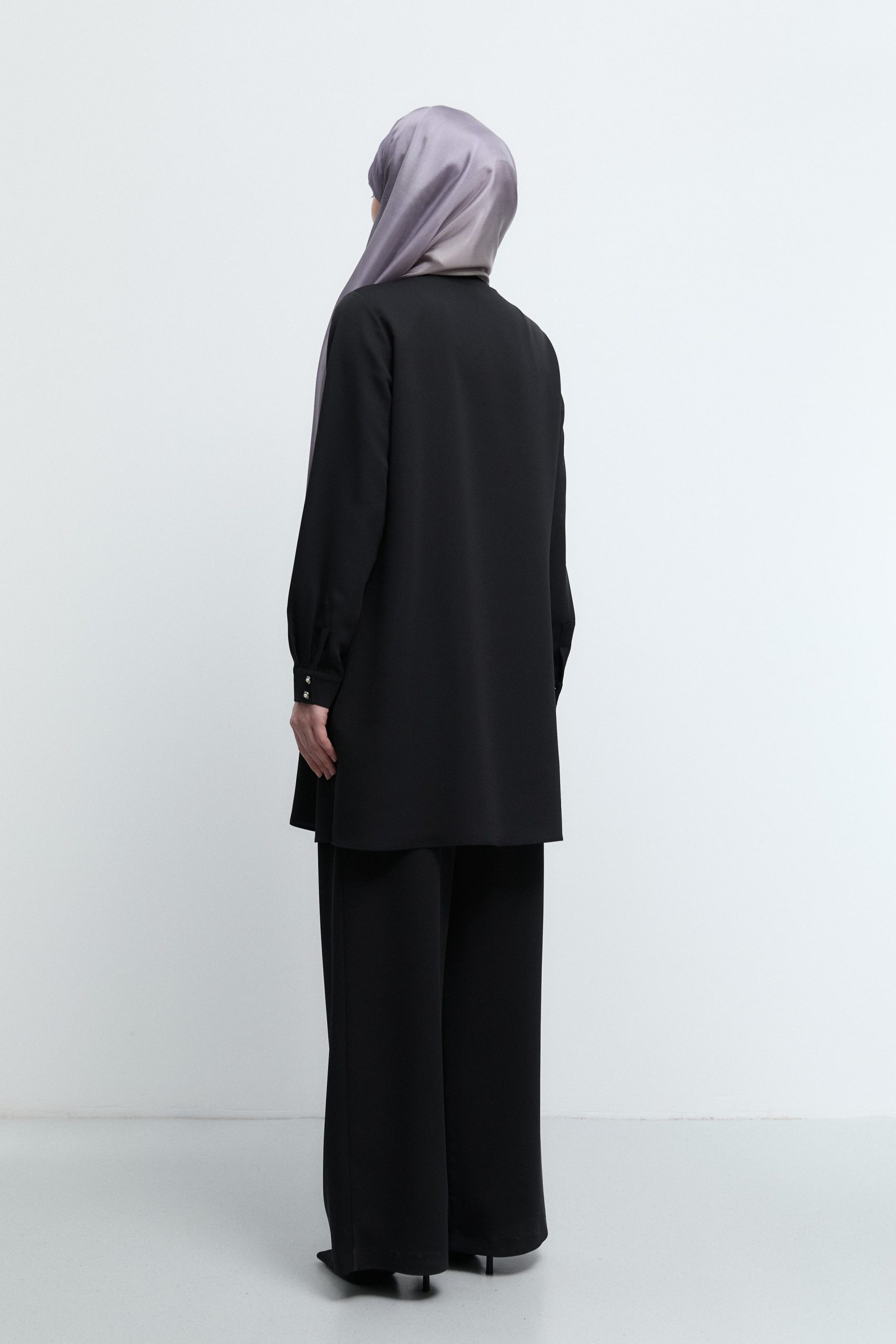 يتميز هذا التونيك بتفاصيل أنيقة من التول في المقدمة، مما يخلق تبايناً رائعاً يجمع بين اللمسات الأنثوية والخطوط العصرية.