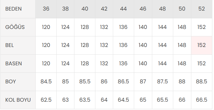 جدول المقاسات: {‘الصدر’: {’36’: ‘120’, ’38’: ‘124’, ’40’: ‘128’, ’42’: ‘132’, ’44’: ‘136’, ’46’: ‘140’, ’48’: ‘144’, ’50’: ‘148’, ’52’: ‘152’}, ‘الخصر’: {’36’: ‘120’, ’38’: ‘124’, ’40’: ‘128’, ’42’: ‘132’, ’44’: ‘136’, ’46’: ‘140’, ’48’: ‘144’, ’50’: ‘148’, ’52’: ‘152’}, ‘الأرداف’: {’36’: ‘120’, ’38’: ‘124’, ’40’: ‘128’, ’42’: ‘132’, ’44’: ‘136’, ’46’: ‘140’, ’48’: ‘144’, ’50’: ‘148’, ’52’: ‘152’}, ‘الطول’: {’36’: ‘84.5’, ’38’: ’85’, ’40’: ‘85.5’, ’42’: ’86’, ’44’: ‘86.5’, ’46’: ’87’, ’48’: ‘87.5’, ’50’: ’88’, ’52’: ‘88.5’}, ‘طول الكم’: {’36’: ‘62.5’, ’38’: ’63’, ’40’: ‘63.5’, ’42’: ’64’, ’44’: ‘64.5’, ’46’: ’65’, ’48’: ‘65.5’, ’50’: ’66’, ’52’: ‘66.5’}}