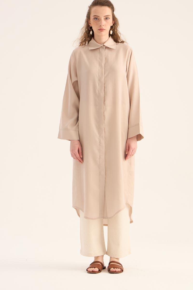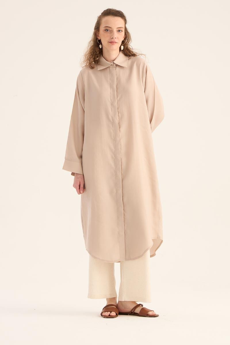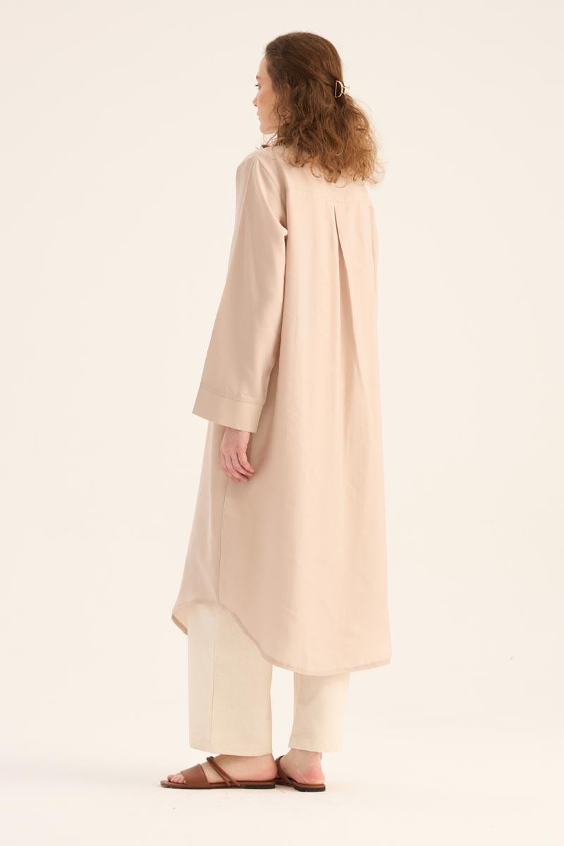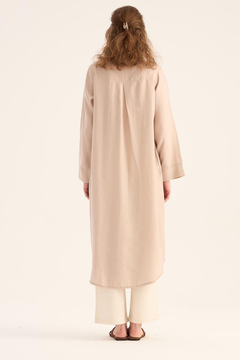 يقدم هذا التونيك الطويل باللون الحجري مظهرًا طبيعيًا ومنعشًا، مما يجعله أحد القطع الخفيفة والأنيقة لموسم الصيف. مصنوع من خليط قماش 88% تينسل و12% بيس، ويوفر راحة طوال اليوم بفضل نسيجه الناعم وهيكله القابل للتنفس. يتميز بتصميم بسيط، وتفاصيل أزرار مخفية، وحاشية منحنية أنيقة، مما يضفي وقفة عصرية.