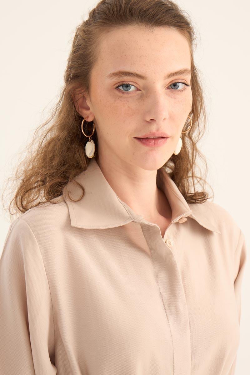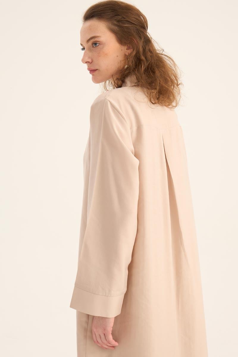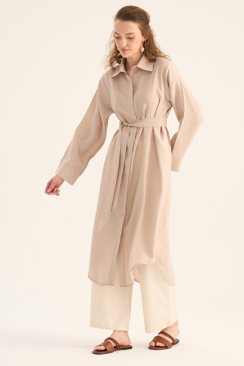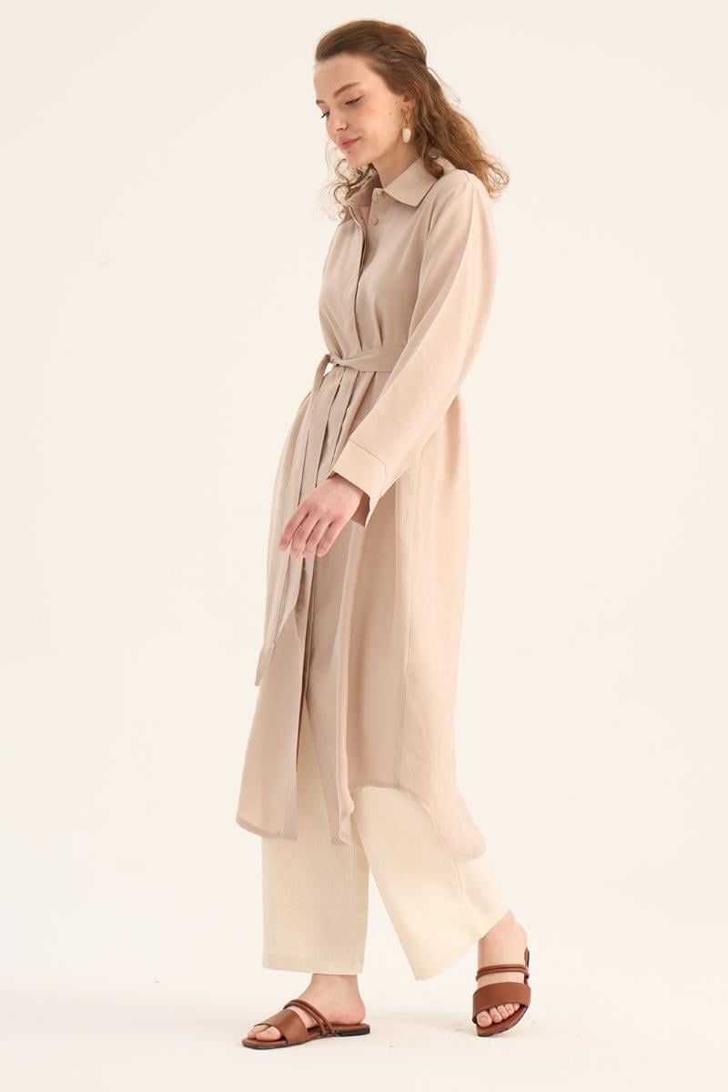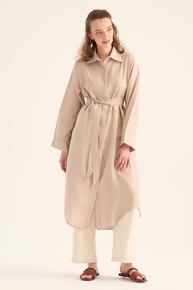 يقدم هذا التونيك الطويل باللون الحجري مظهرًا طبيعيًا ومنعشًا، مما يجعله أحد القطع الخفيفة والأنيقة لموسم الصيف. مصنوع من خليط قماش 88% تينسل و12% بيس، ويوفر راحة طوال اليوم بفضل نسيجه الناعم وهيكله القابل للتنفس. يتميز بتصميم بسيط، وتفاصيل أزرار مخفية، وحاشية منحنية أنيقة، مما يضفي وقفة عصرية.