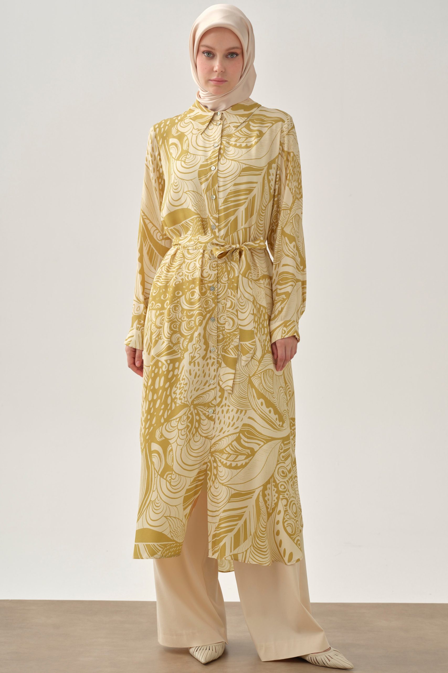 يقدم هذا التونيك الطويل بنقشاته الأنيقة وتفاصيل الحزام على الخصر مظهرًا أنثويًا راقيًا، ممزوجًا بالأناقة والراحة. خيار مثالي للملابس اليومية أو للمناسبات الخاصة.