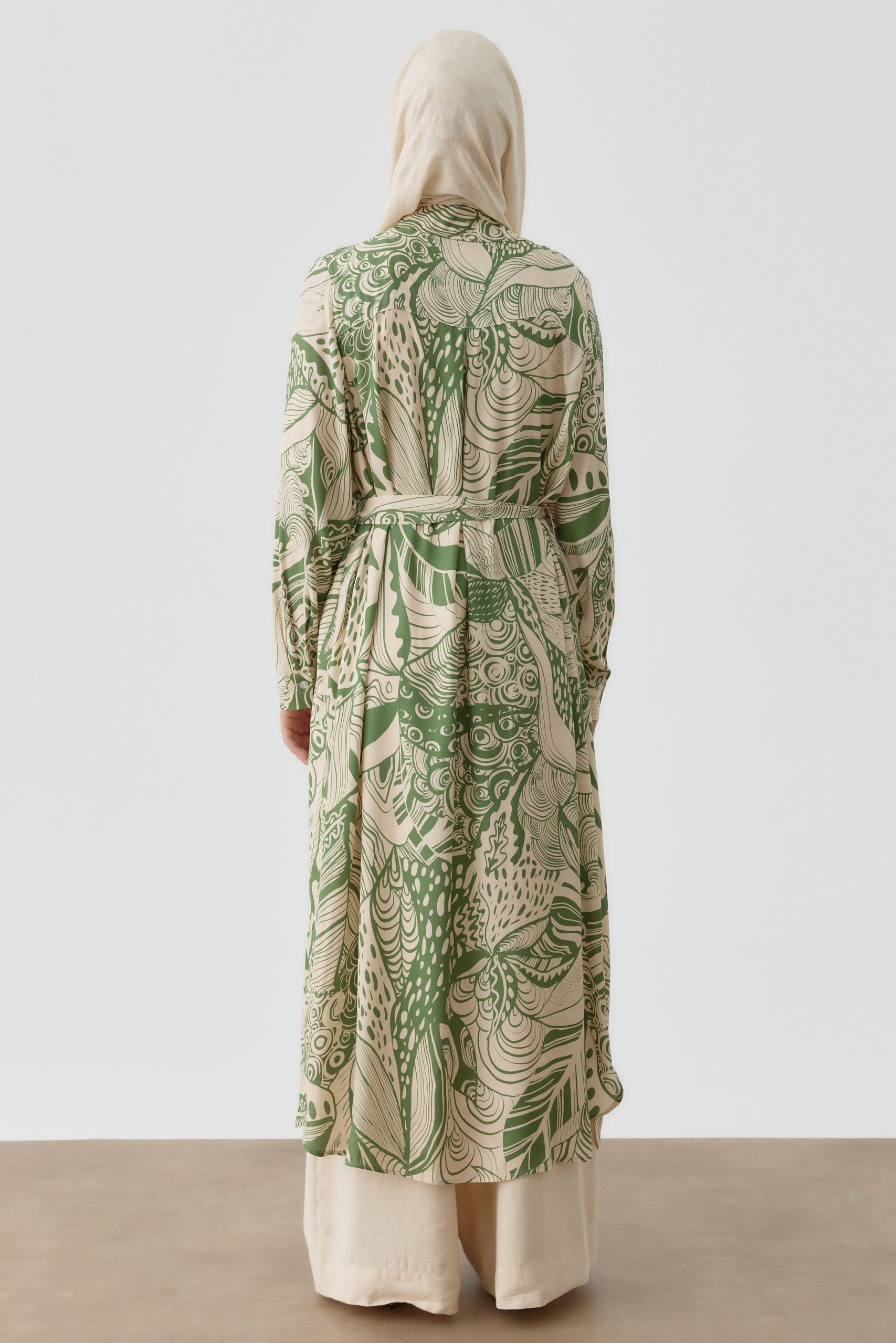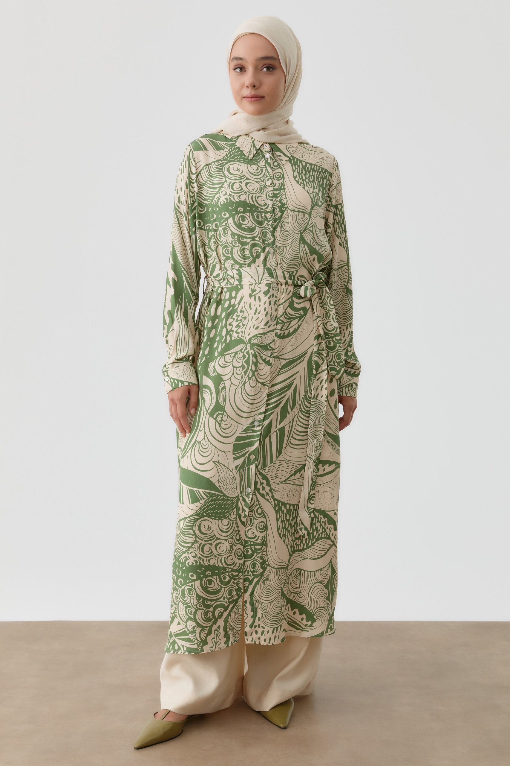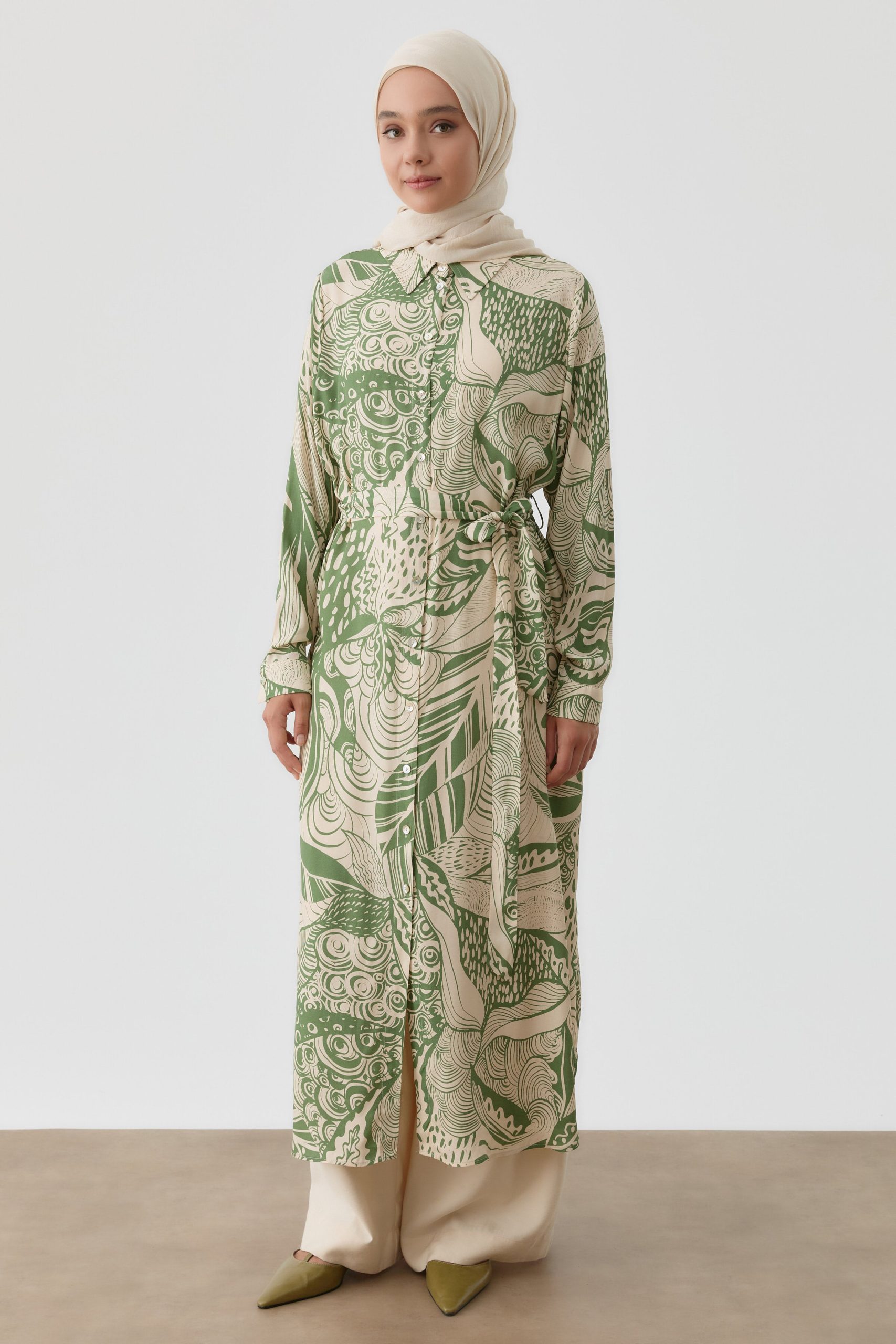 تونيك طويل مزين بحزام وبتصميم – لون الكاكي