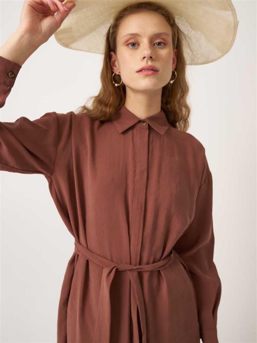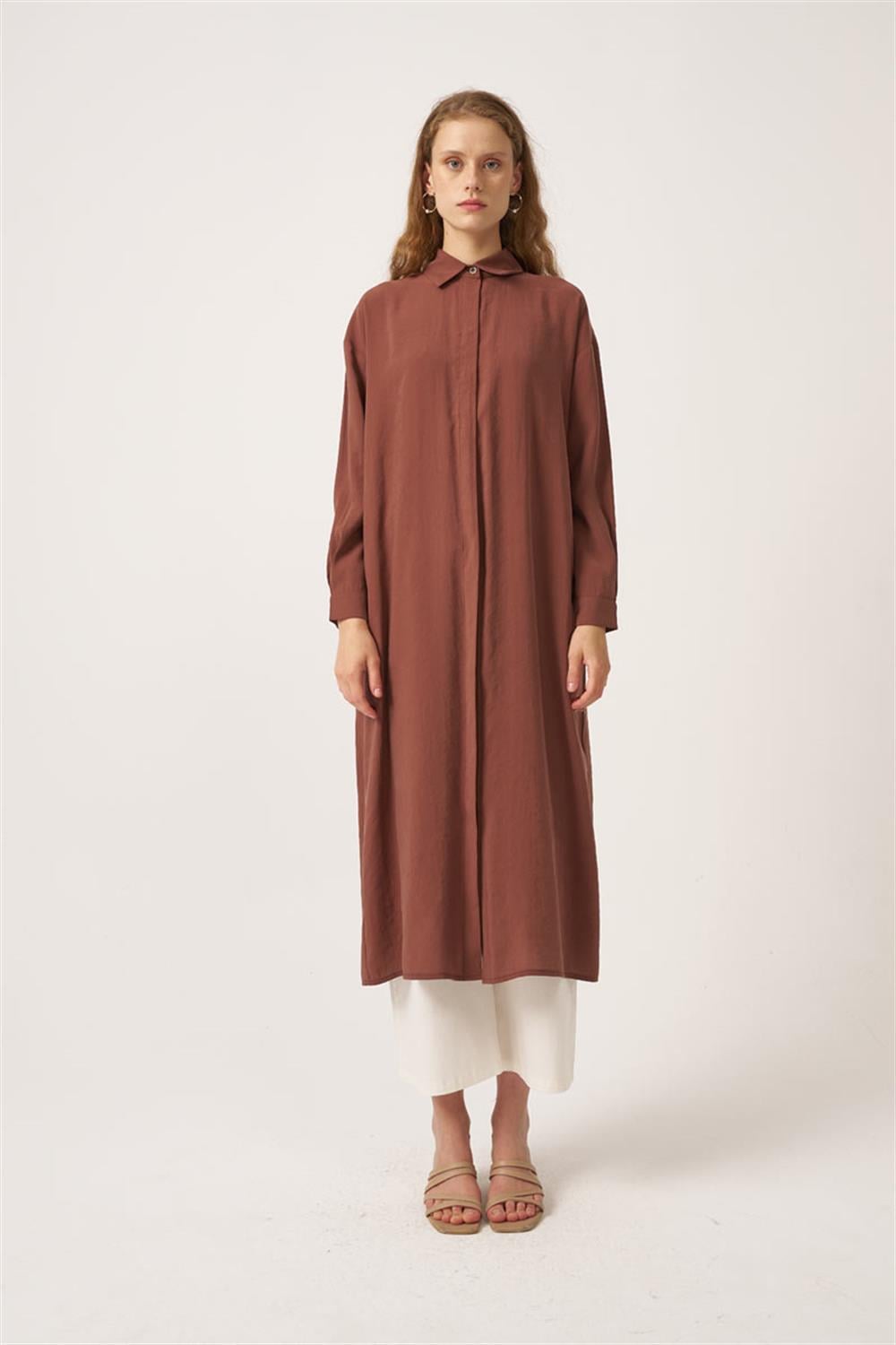 تونيك طويل مطوي باللون البني، متوفر لدى مينيك تيرزي بسعر 1,899.00 ليرة تركية. تسوق الآن بتصميم أنيق وبسيط، وقص مريح، وأسعار مناسبة!