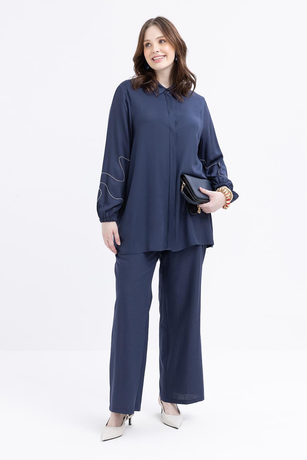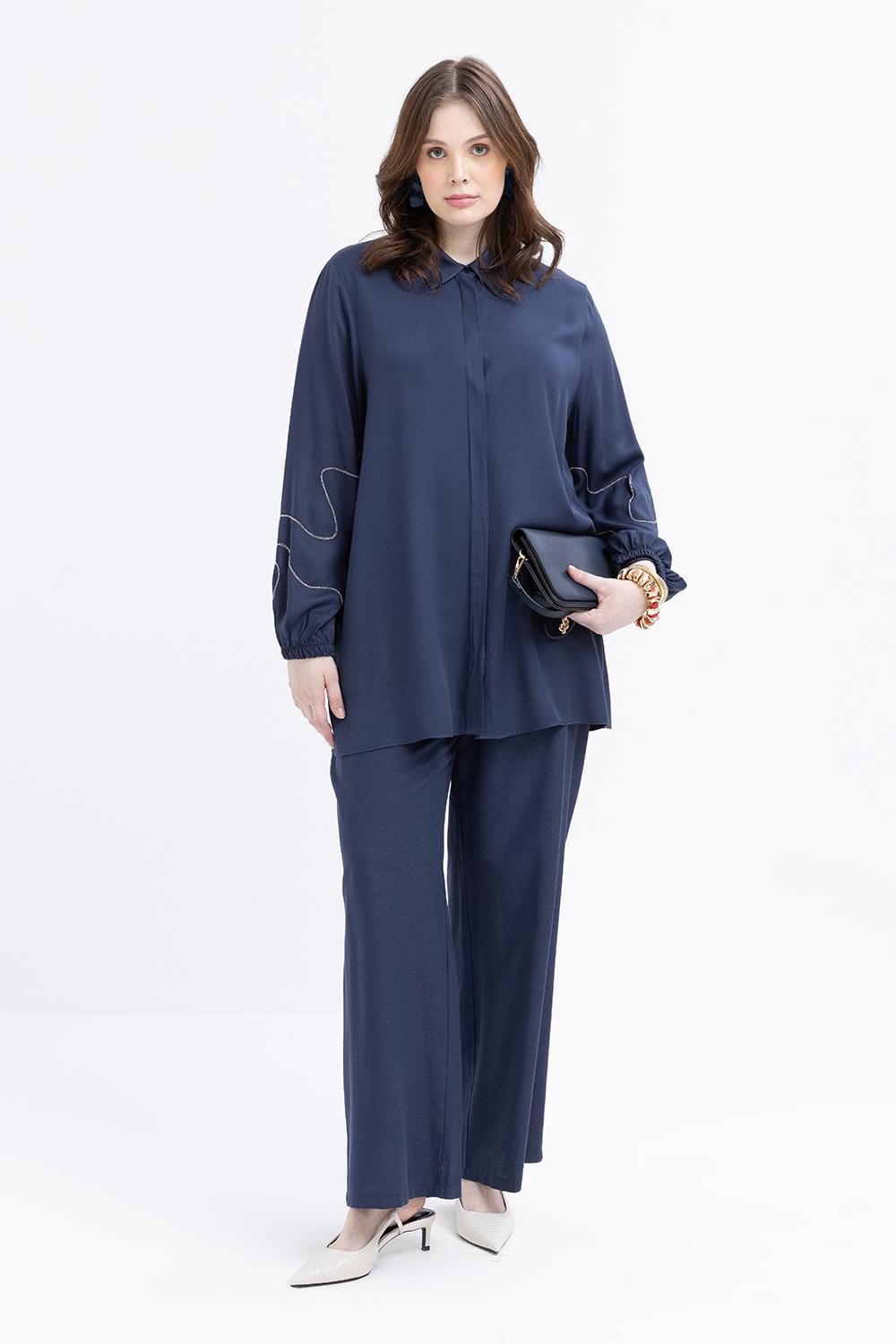 تونيك قميص باللون النيلي مع تطريز السلسلة وأكمام مطاطية