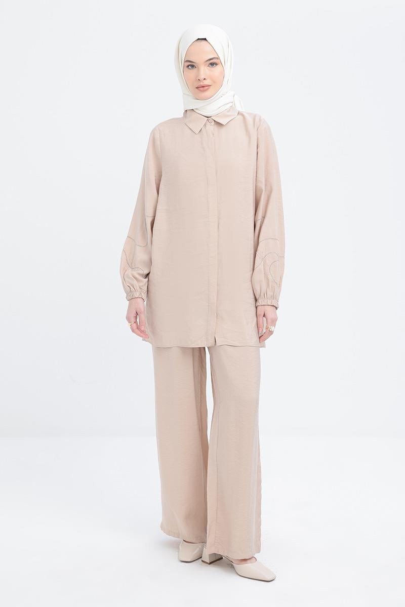 تونيك قميص بيج بأكمام مطاطية مطرزة بالسلاسل