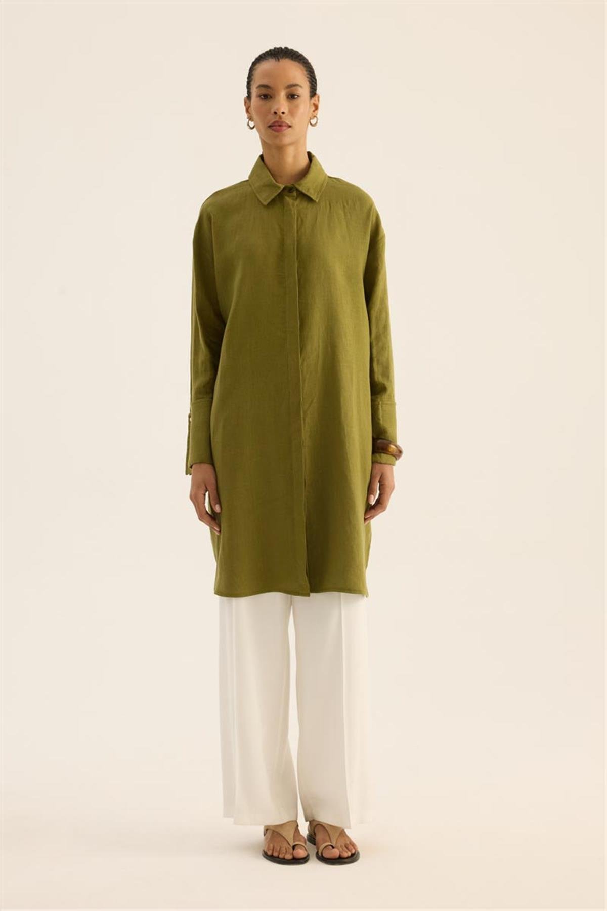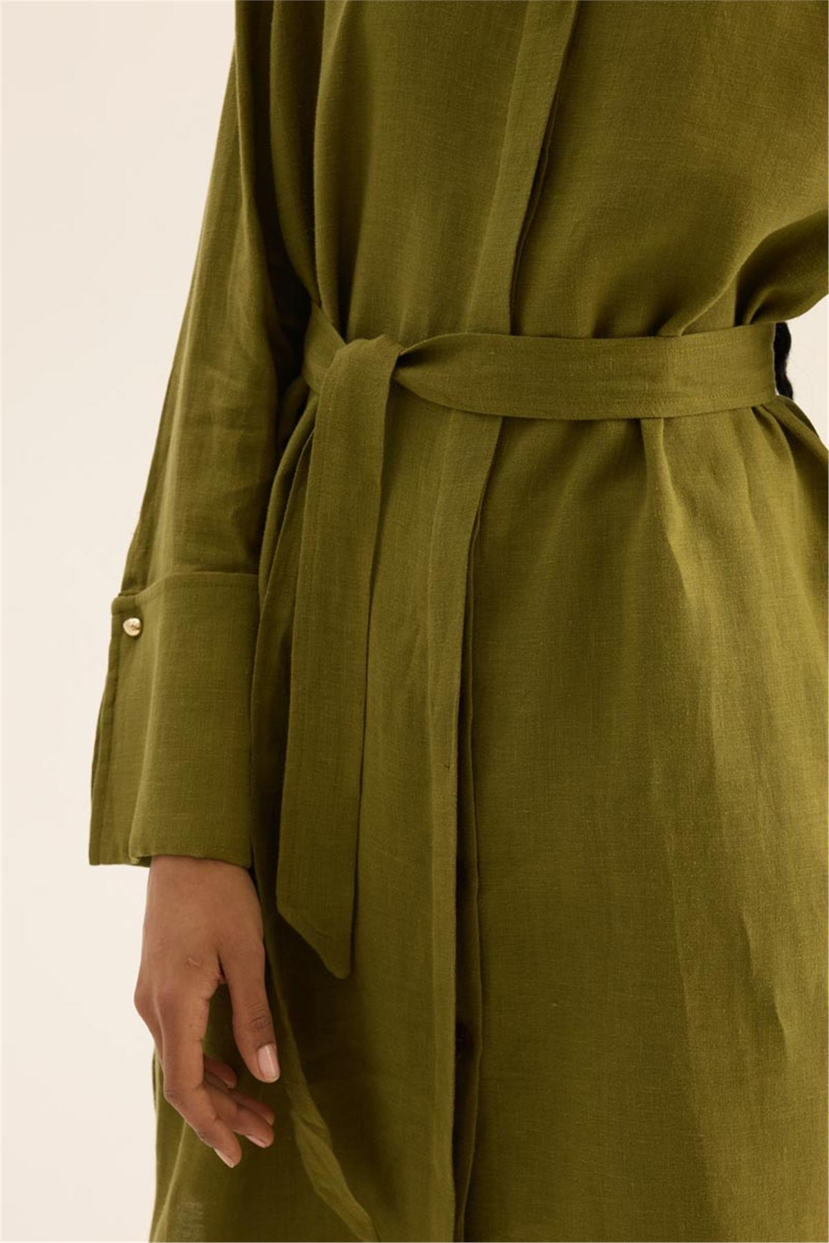 تونيك كتان خاكي ١٠٠٪ بأكمام واسعة