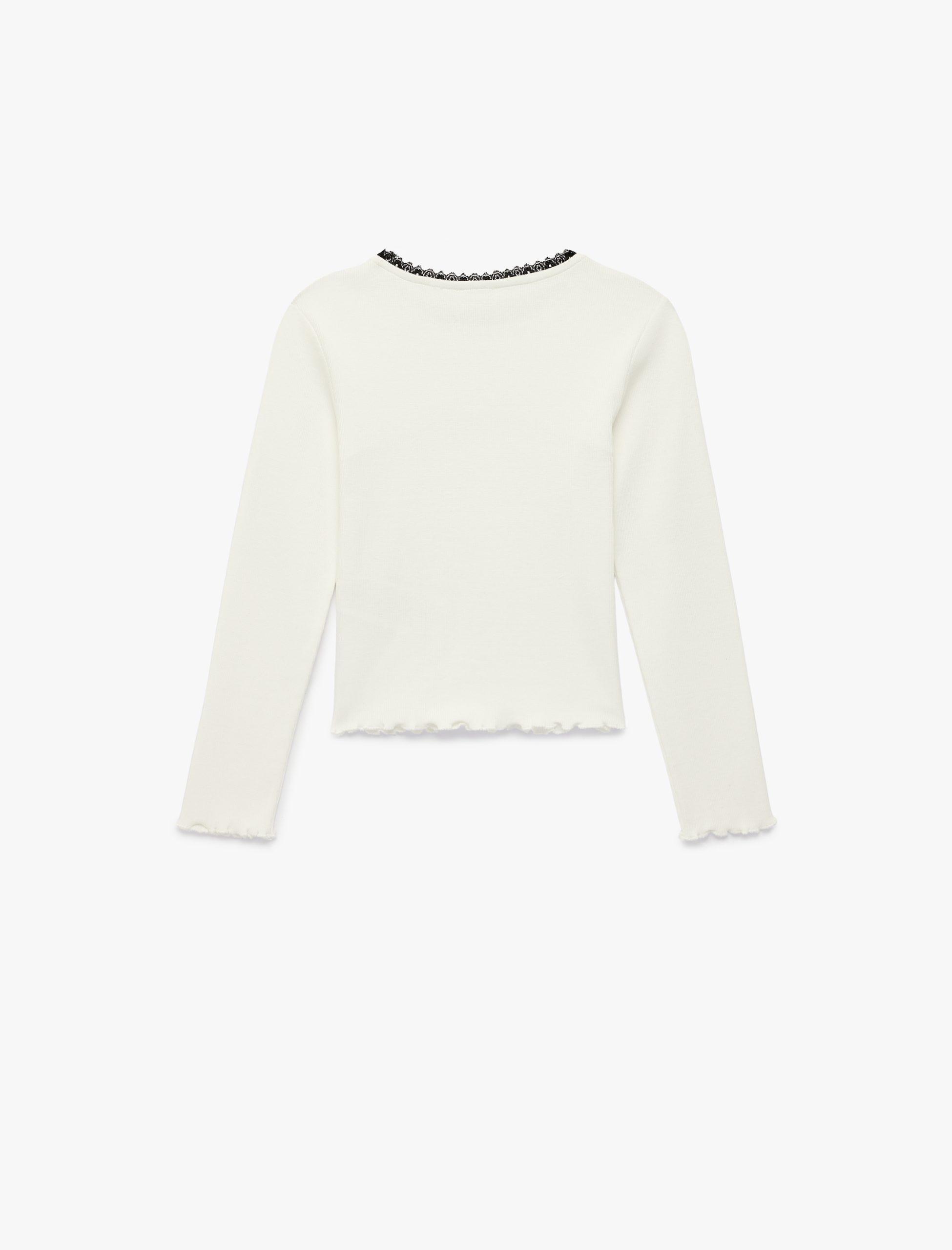 تيشيرت بأكمام طويلة يتميز بتفاصيل دانتيل رقيقة وتصميم جذاب وأنيق ليصبح المفضل لدى طفلتك. مع خط العنق المستدير وتفاصيل الدانتيل الرقيقة، يقدم ستايلاً متعدد الاستخدامات مثاليًا للارتداء اليومي. القماش الناعم الغني بالقطن يضمن الراحة طوال اليوم، بينما تضيف تطريزات الدانتيل لمسة أنيقة.