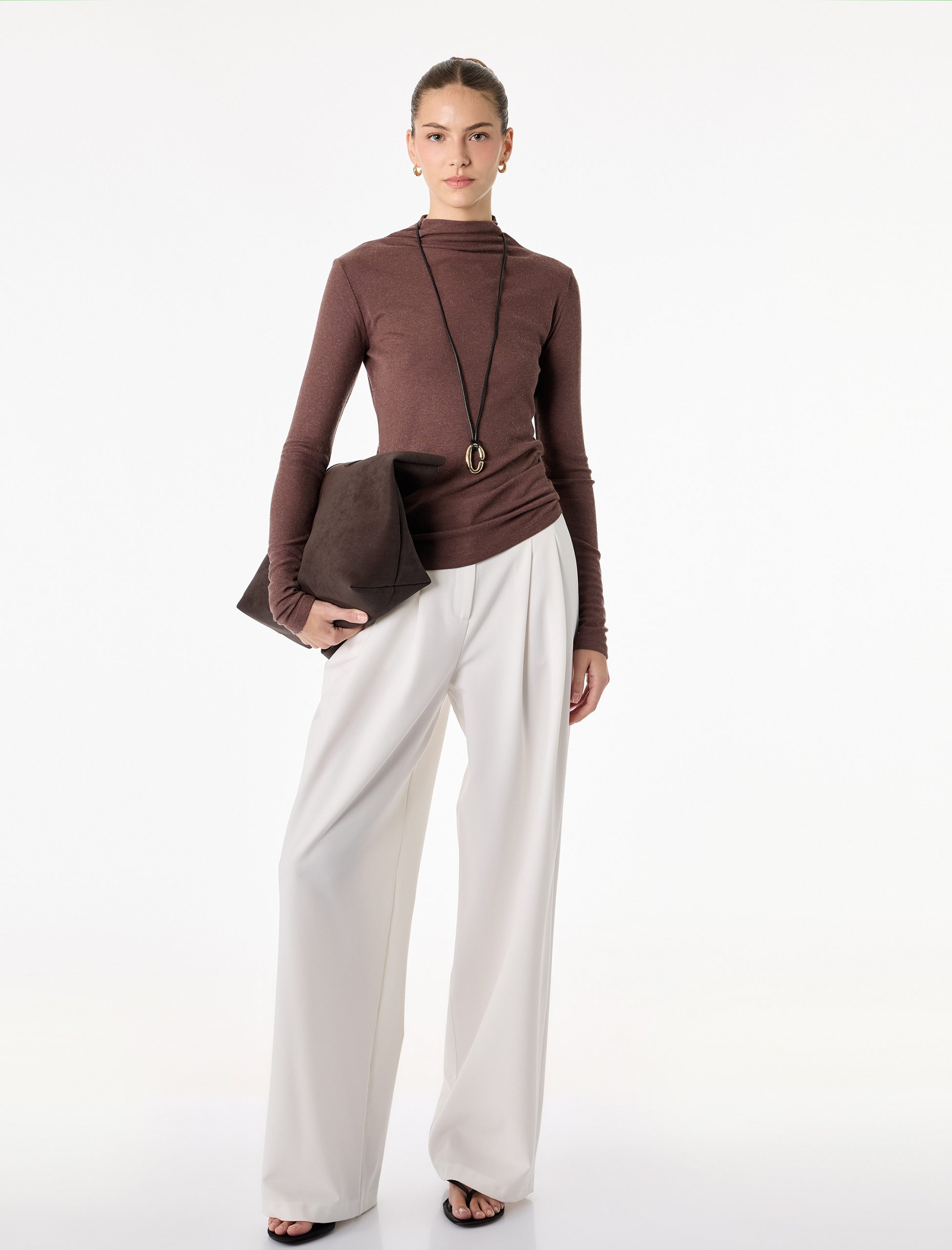 للحصول على أناقة مكتبية، قم بتنسيقه مع بنطلون بالازو وجاكت بليزر. للمظهر العادي، أنشئ إطلالة رياضية مع جينز وأحذية رياضية. أكمِل إطلالتك بقلادات بسيطة لتسليط الضوء على أناقتك.