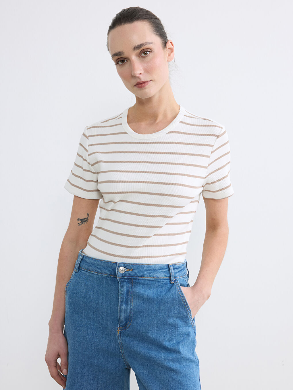 تيشيرت LCW EVERYDAY النسائي بخطوط بلون البيج مع رقبة مستديرة – متاح لدى LCW مع خصومات حصرية، خيارات الدفع بالتقسيط، ومزايا الدفع عند الاستلام! تسوقي عبر الإنترنت الآن واحصلي على المنتج على باب منزلك! – S6BY98Z8-ELZ