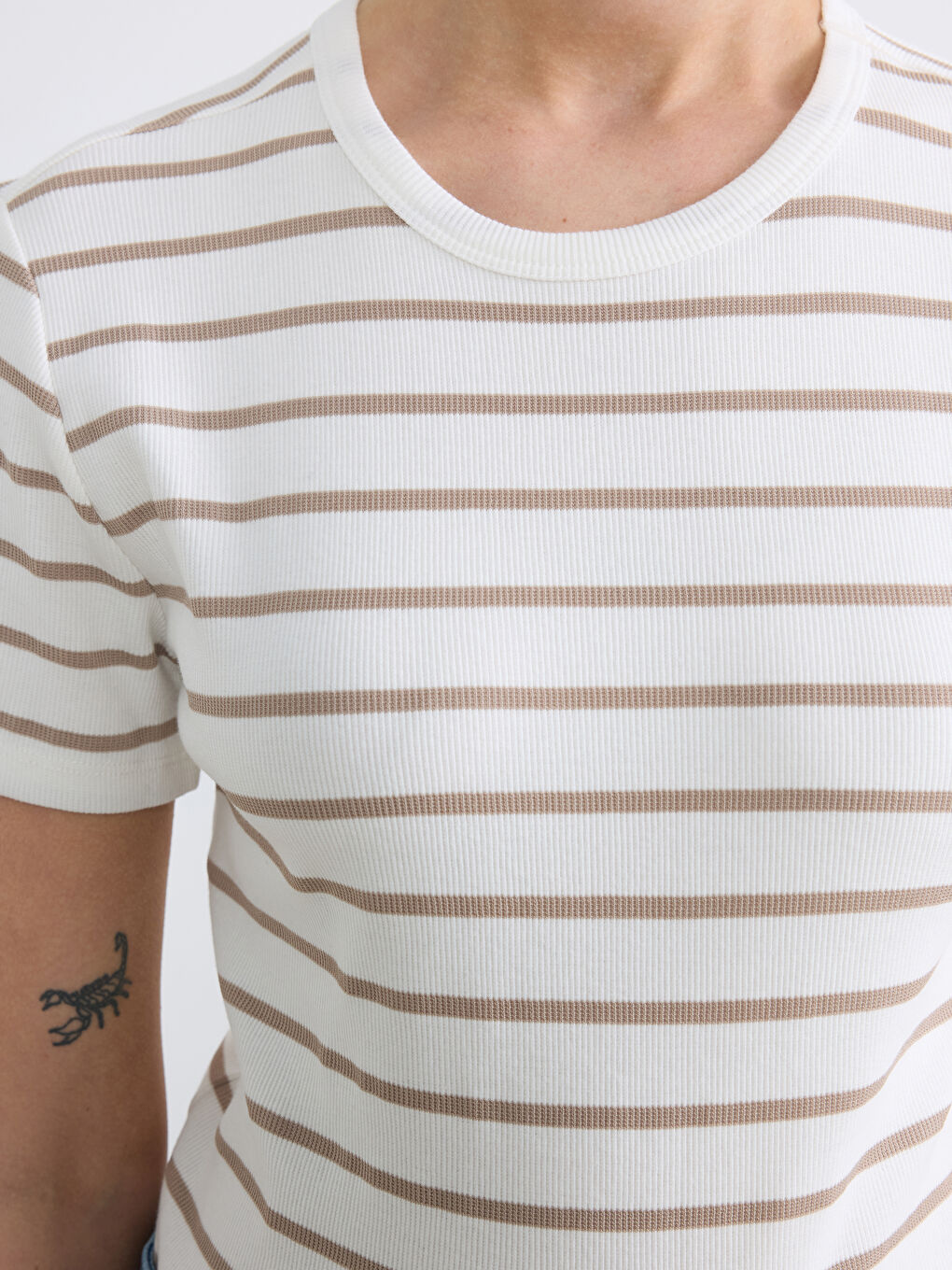 تيشيرت نسائي بخطوط بلون البيج مع رقبة مستديرة