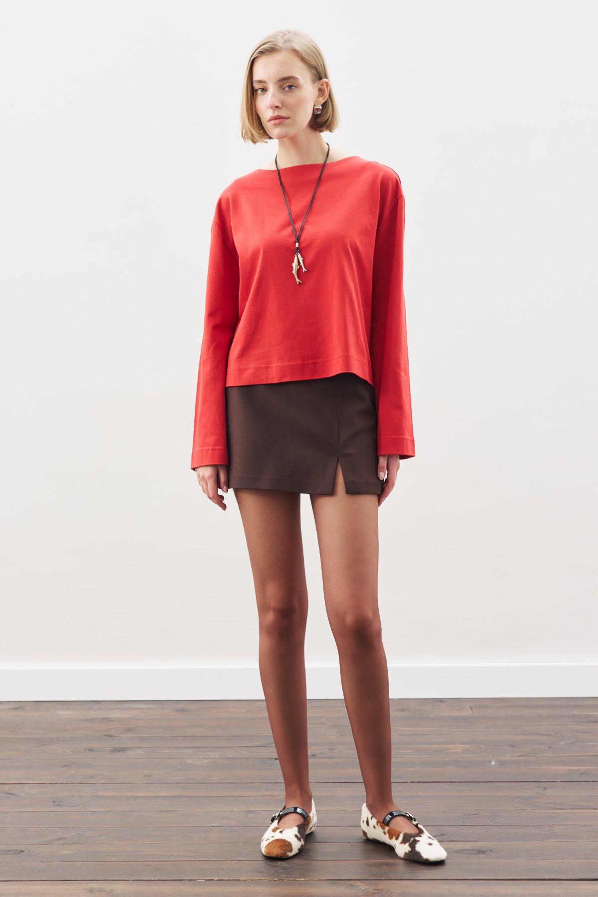 تي شيرت أحمر بكم طويل ورقبة على شكل قارب