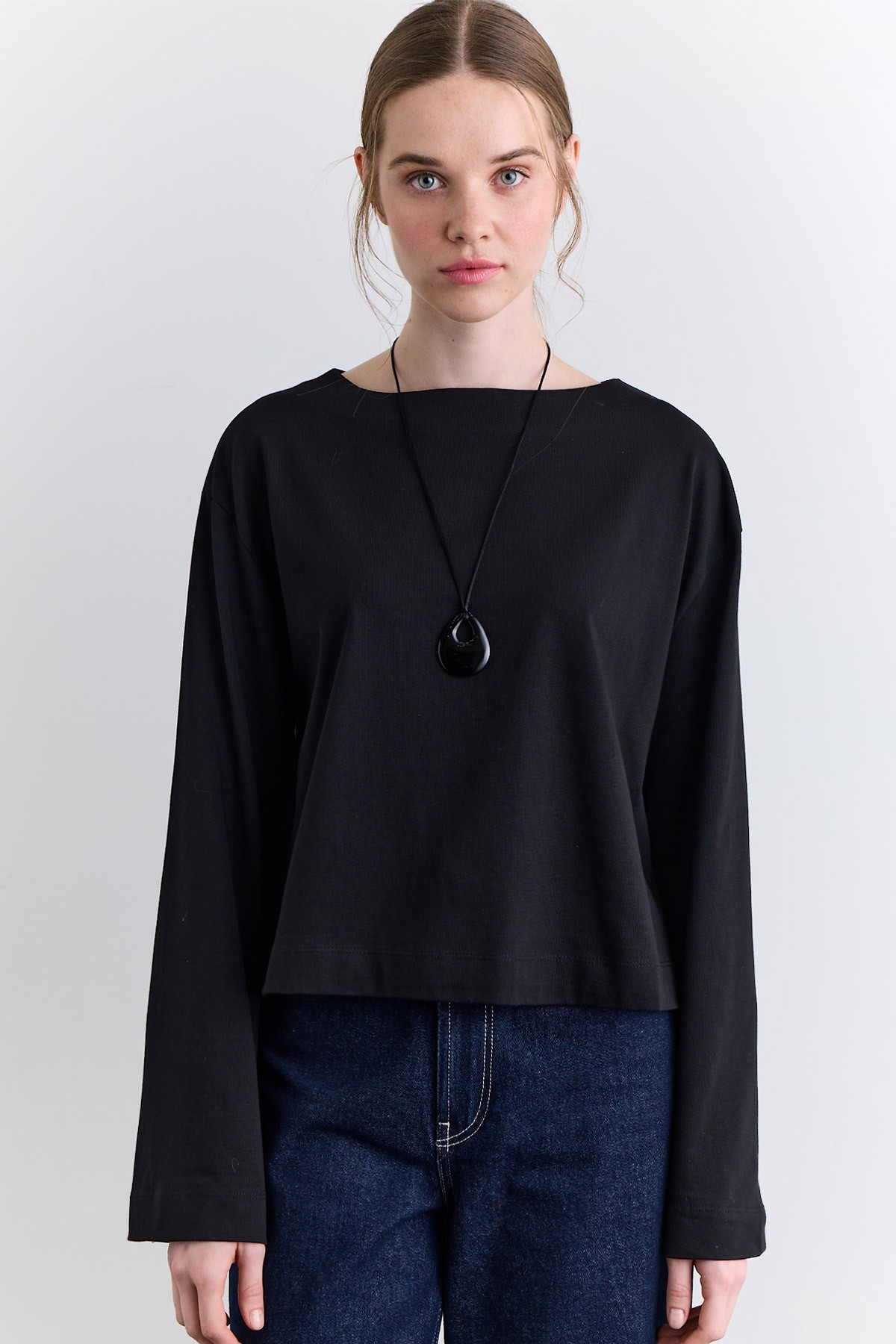 تي شيرت أسود بكم طويل ورقبة على شكل قارب