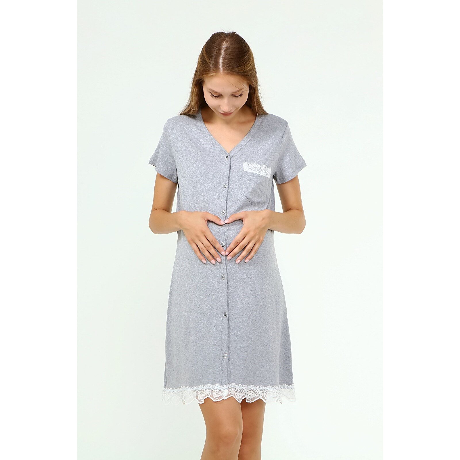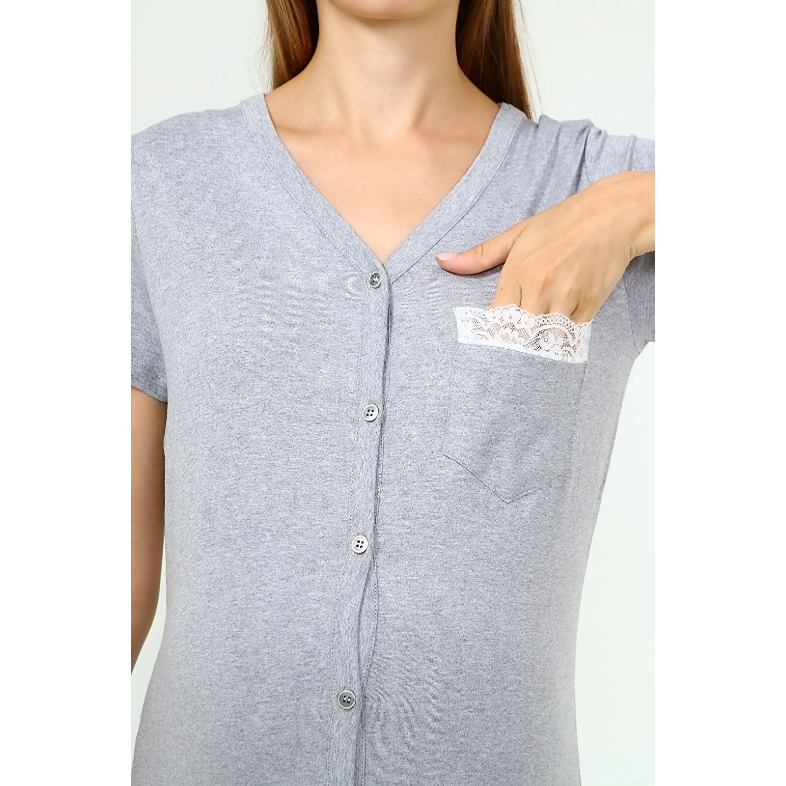 ثوب النوم النسائي الرمادي للحامل مع أزرار وتطريز دانتيل وجيوب
