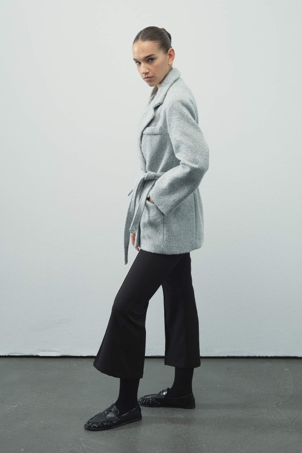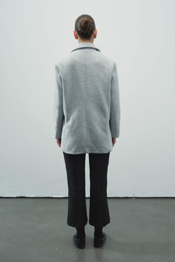 جاكت بليزر رمادي ذو ياقة مزدوجة وقماش صوفي