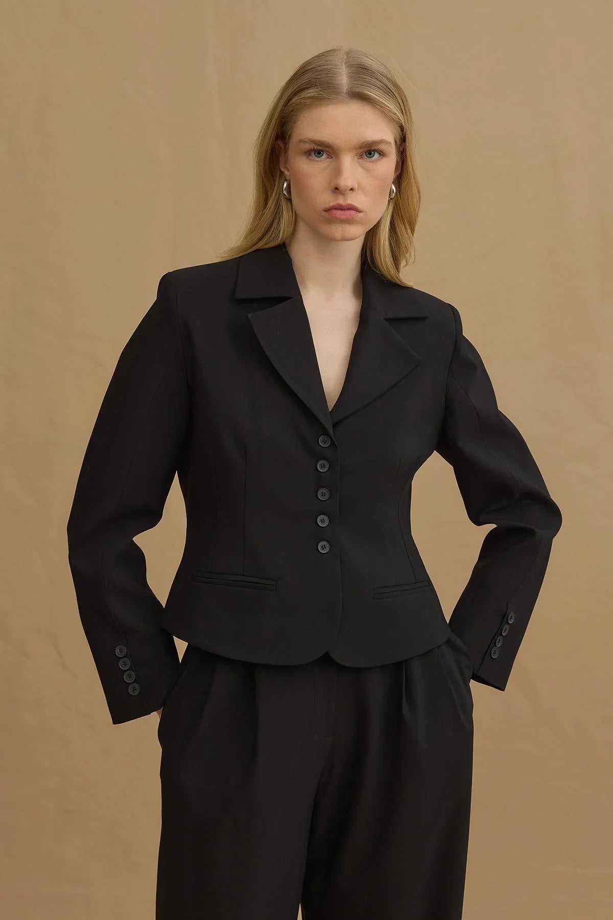 مصنوع من نسيج البولي فيسكوز الراقي، يتميز هذا الجاكيت بياقة لابل، وإغلاق بزر واحد، وملاءمة تحتضن الجسم مع تفاصيل مطوية.