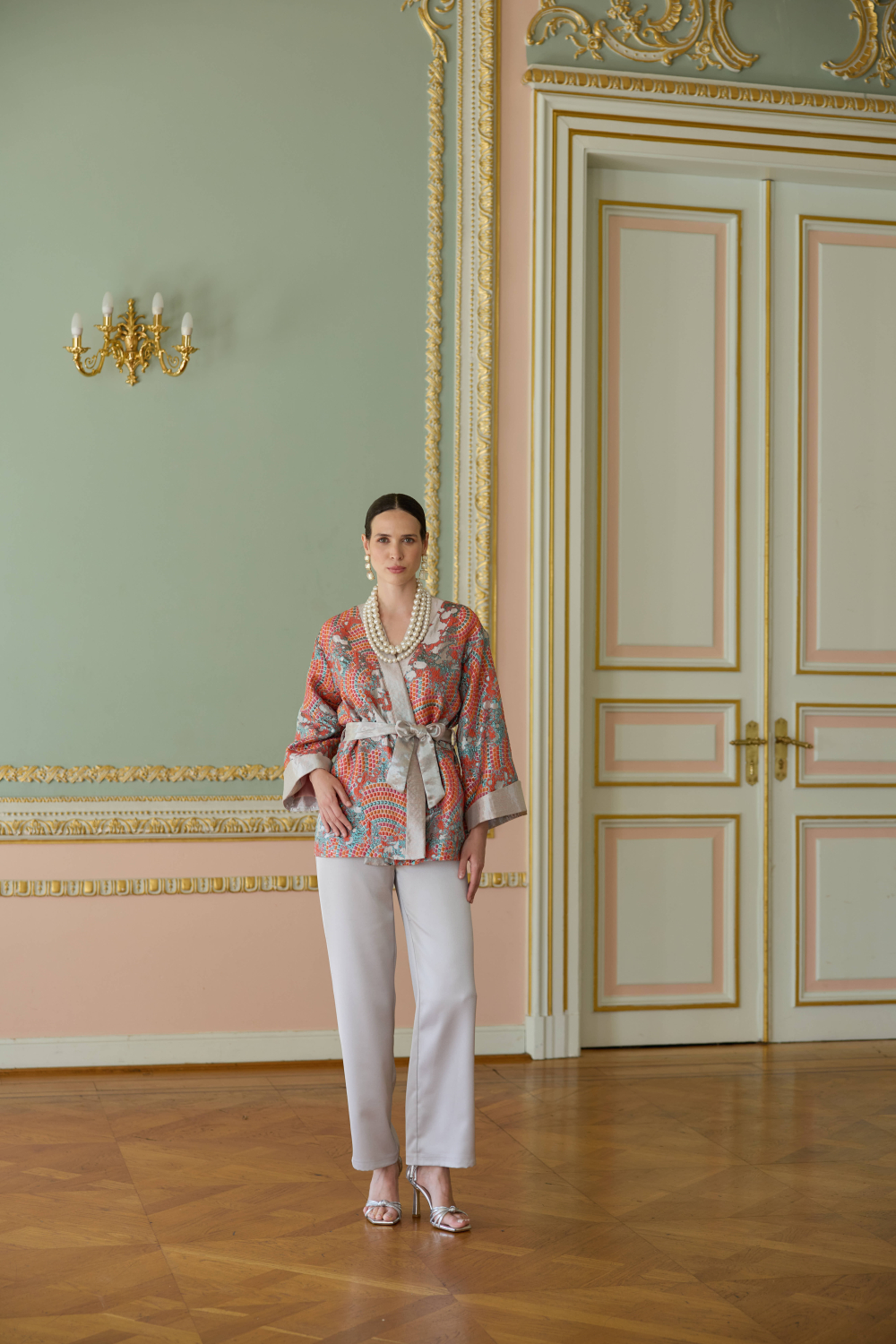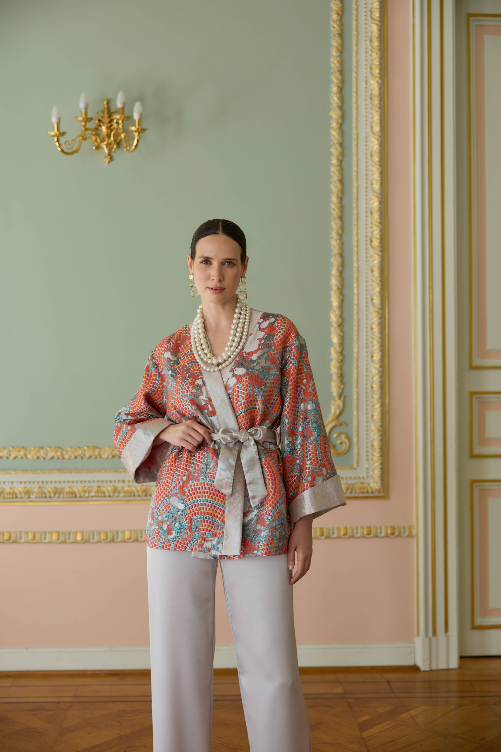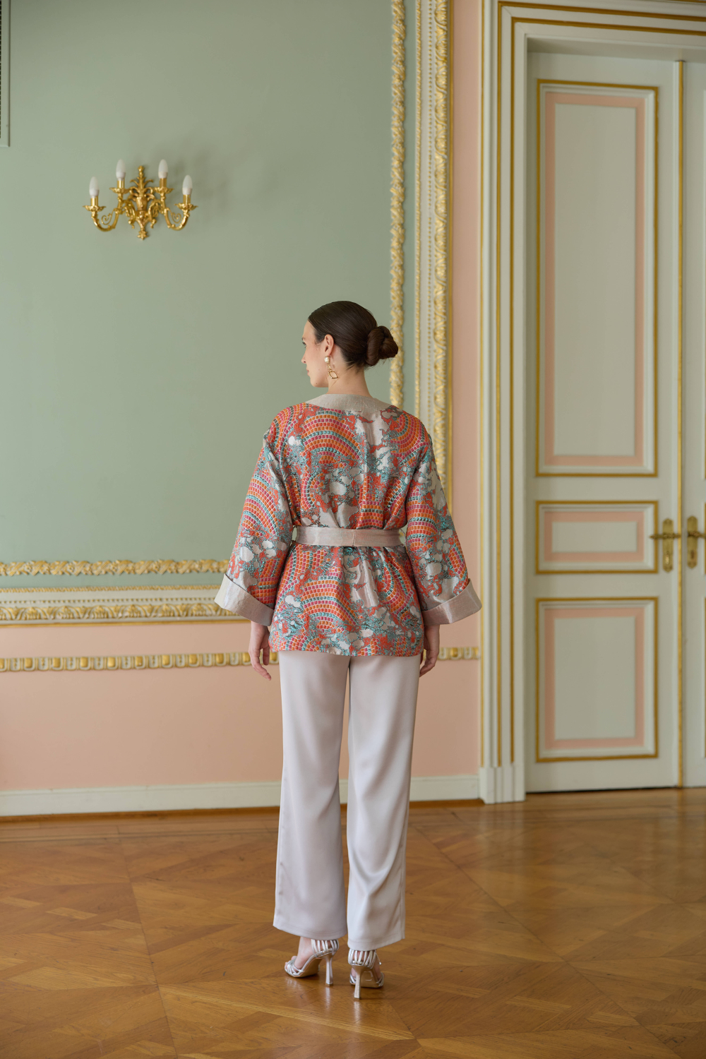 كيمونو جاكار مزين من المجموعة الخاصة. يتميز بتصميم فريد. مبطن من الداخل. مقاسات المنتج؛ يأتي مع حزام قابل للتعديل. خصائص المنتج للمقاس الواحد؛ الصدر 124 سم، الخصر 124 سم، الورك 126 سم، طول المنتج 75 سم. المقاس على العارضة 1، طول العارضة 177 سم. المقاس 1: 36-38-40، المقاس 2: 40-42-44.