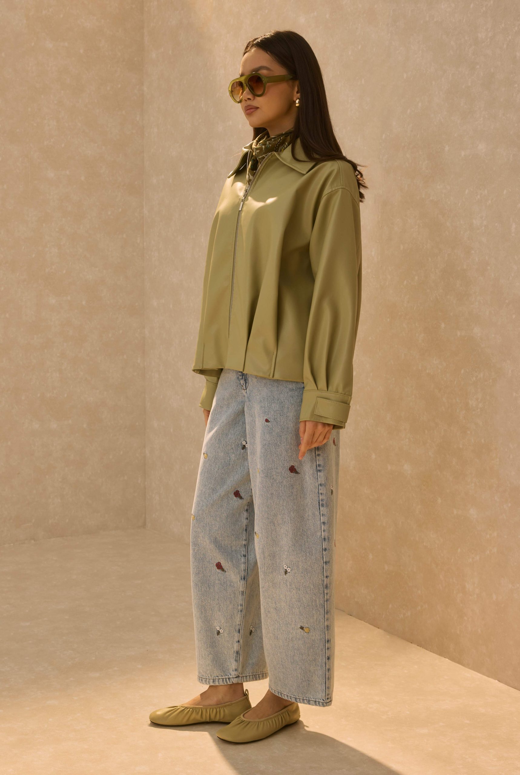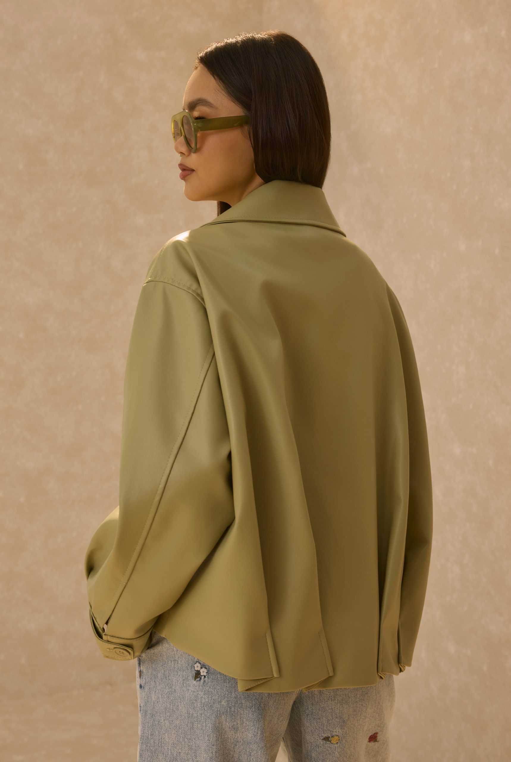 جاكيت جلد بتفاصيل الفرو بلون المريمية