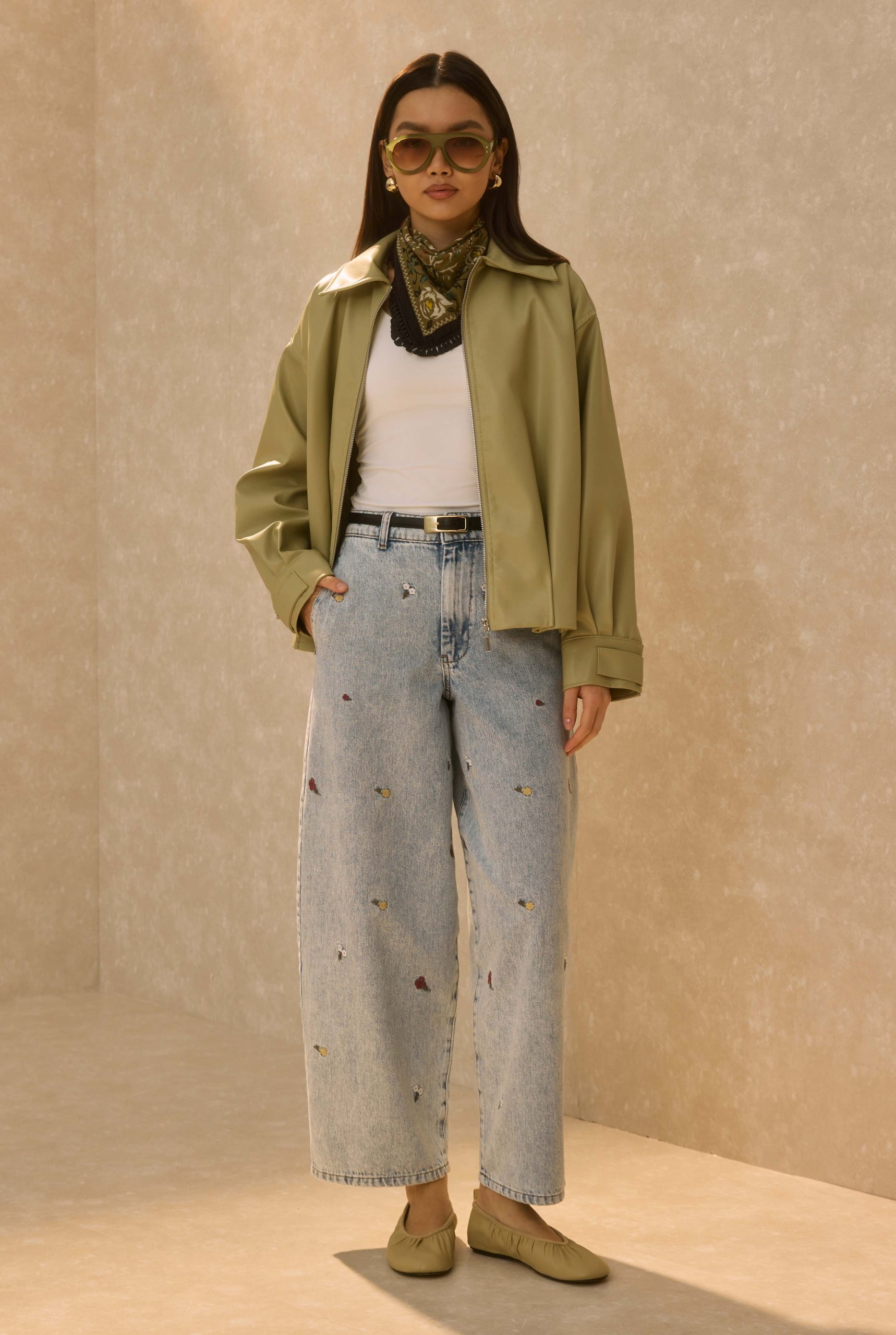 تفاصيل الفرو في الخلف تضيف حركة وحجماً للجاكيت، مكونةً شكلاً فريداً يبرز عن أشكال الجاكيتات الجلدية التقليدية. مكتملاً بتفاصيل السحاب، يقدم هذا التصميم بياناً جريئاً ولافتاً عند تنسيقه مع قطع ملونة.