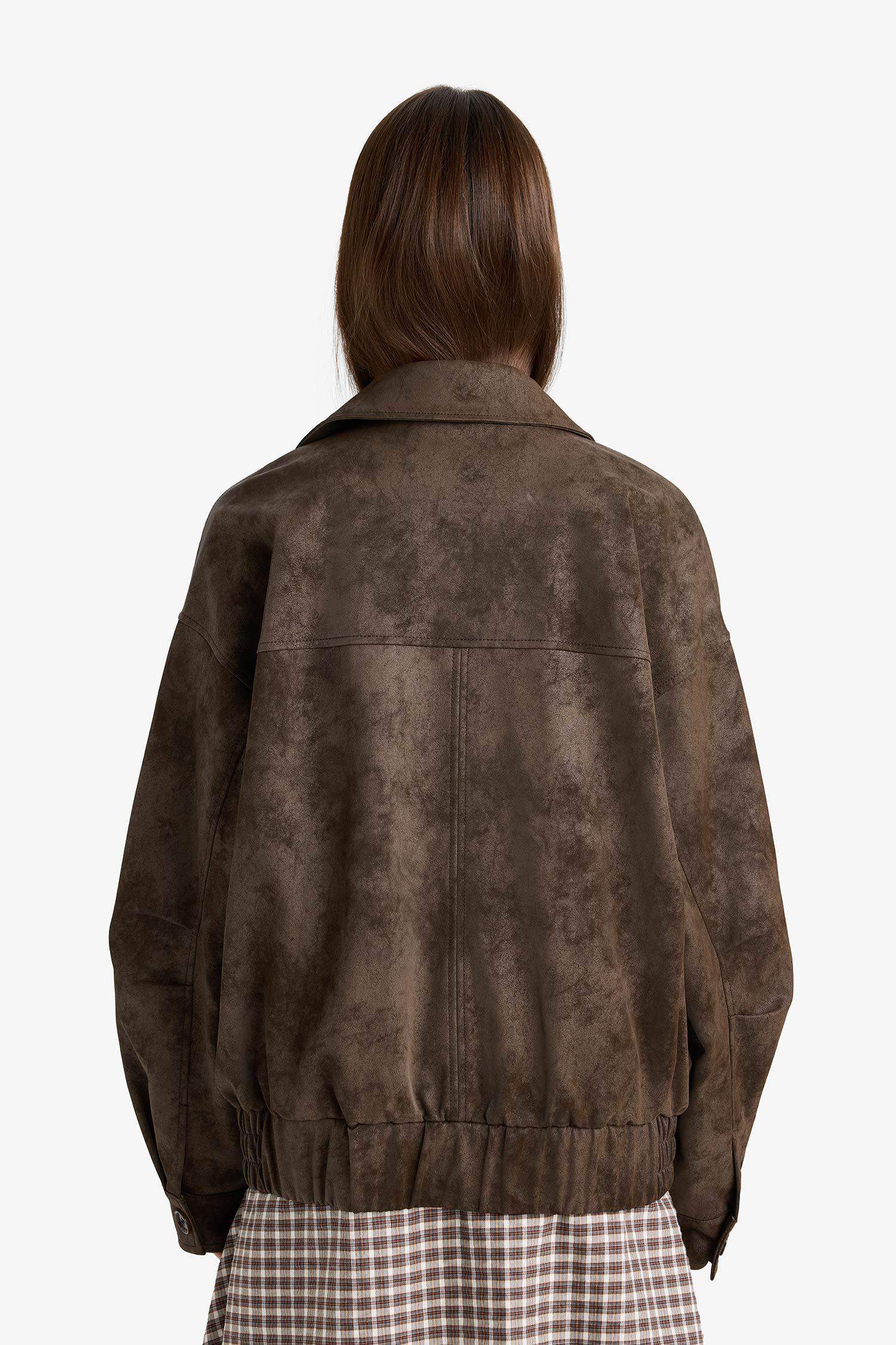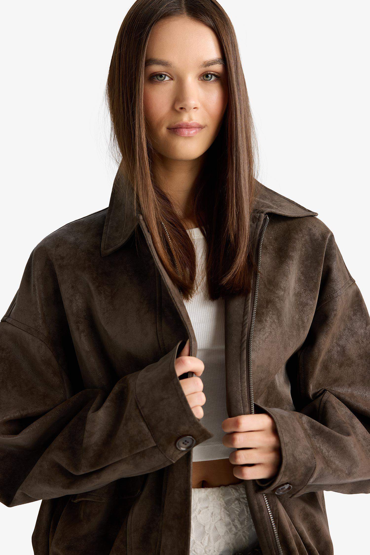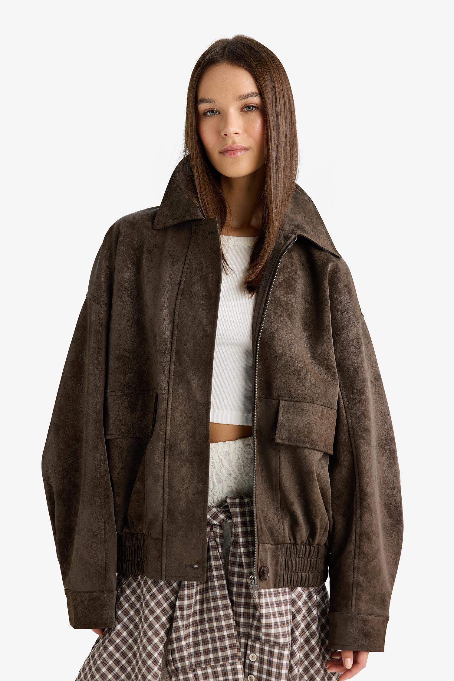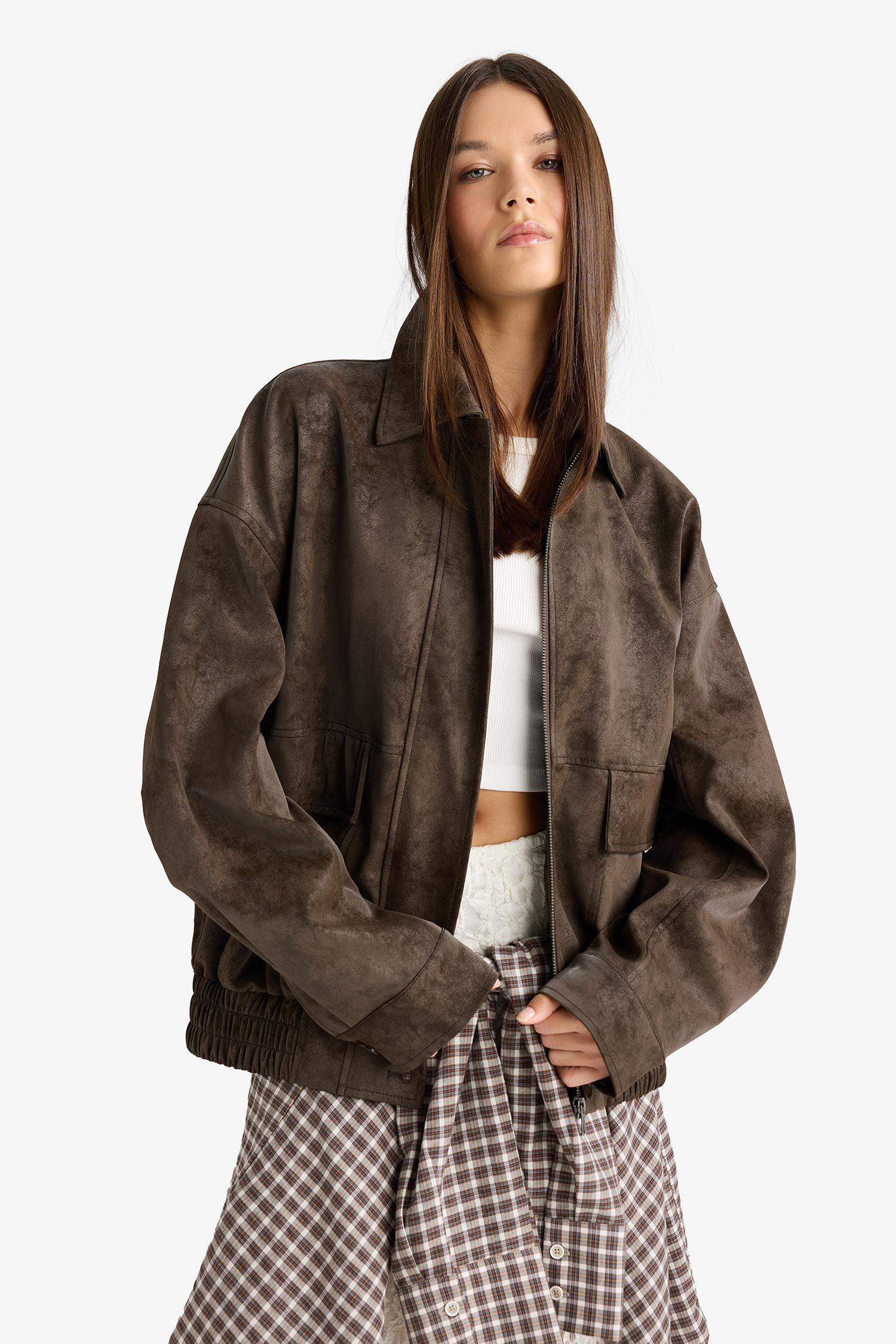 جاكيت جلد صناعي بقلب بولو وفتحة أمامية بقفل سحاب من أفرة ودي فاكتو بتصميم Dad Fit