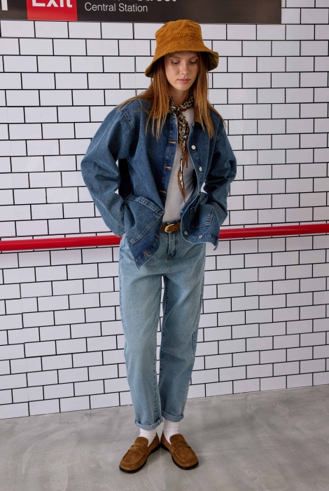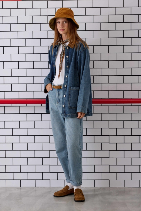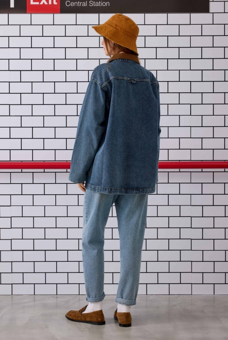تم تصنيع هذا الجاكيت من قماش الدنيم المنسوج من خيوط قطنية 100%، مما يجعله قابلاً للتنفس بفضل تركيبته الطبيعية ويوفر راحة طوال اليوم. تفاصيل المخمل المستخدمة في المنتج تبرز منطقة الياقة، مما يمنح المظهر أناقة رجعية متطورة. المنتج ذو قصة واسعة؛ يمكن للذين لا يفضلون القصة الواسعة كما هو موضح على العارضة اختيار مقاس أصغر. يجب غسله برفق على درجة حرارة 30 مئوية. لا يجفف في المجفف. الطول: 74.5 سم (قد يختلف طول المنتج بين 1-5 سم بين الإنتاجات). معلومات القياسات: الصدر – الوركين – طول الكم – محيط العضد: المقاس S: 110 سم – 110 سم – 56 سم – 52 سم، المقاس M: 114 سم – 114 سم – 57 سم – 54 سم، المقاس L: 118 سم – 118 سم – 58 سم – 56 سم. قياسات العارضة: الطول: 174 سم، الصدر: 83 سم، الخصر: 60 سم، الوركين: 90 سم. المقاس الذي ترتديه العارضة: S.