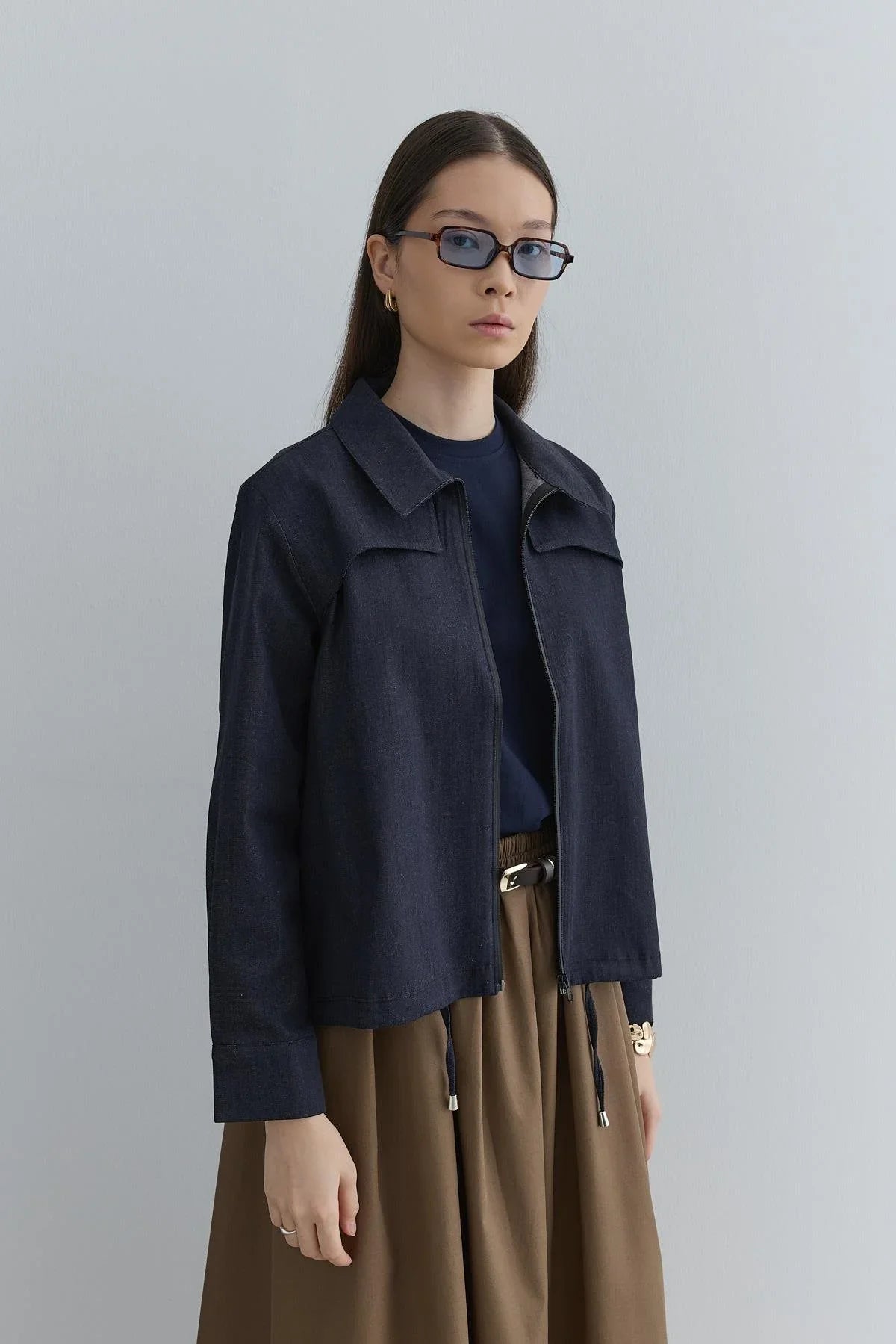 جاكيت مصنوع من قماش الدينم الناعم، يتميز بتفاصيل واقي أمامي، وإغلاق بسحاب، وتفاصيل نفق في حافة الجاكيت وأشرطة داخلية، وأكمام طويلة مع أساور. القياس 1(36-38): الطول: 60 سم، طول الكم: 56 سم، الصدر: 53 سم، الخصر: 53 سم، المسافة بين الكتفين: 42 سم. القياس 2(40-42): الطول: 61 سم، طول الكم: 58 سم، الصدر: 55 سم، الخصر: 55 سم، المسافة بين الكتفين: 43 سم.