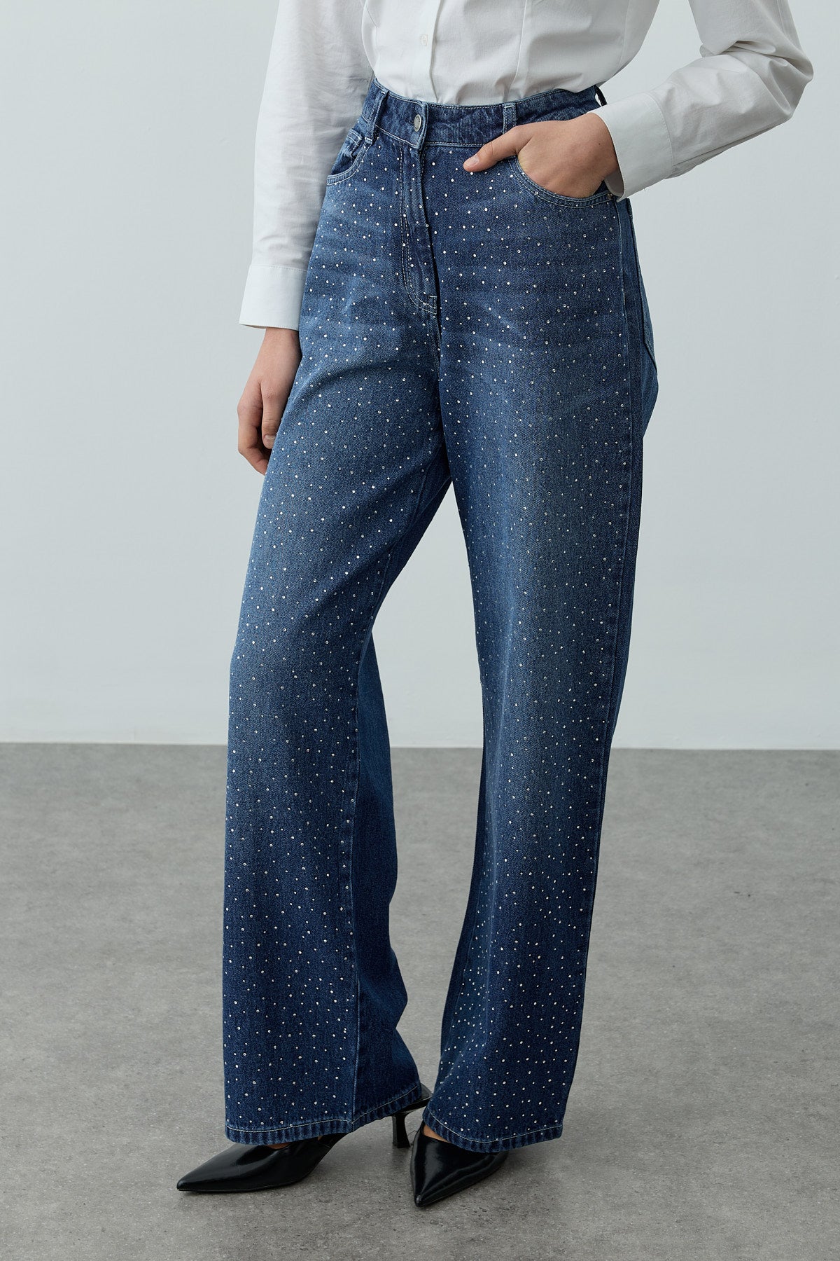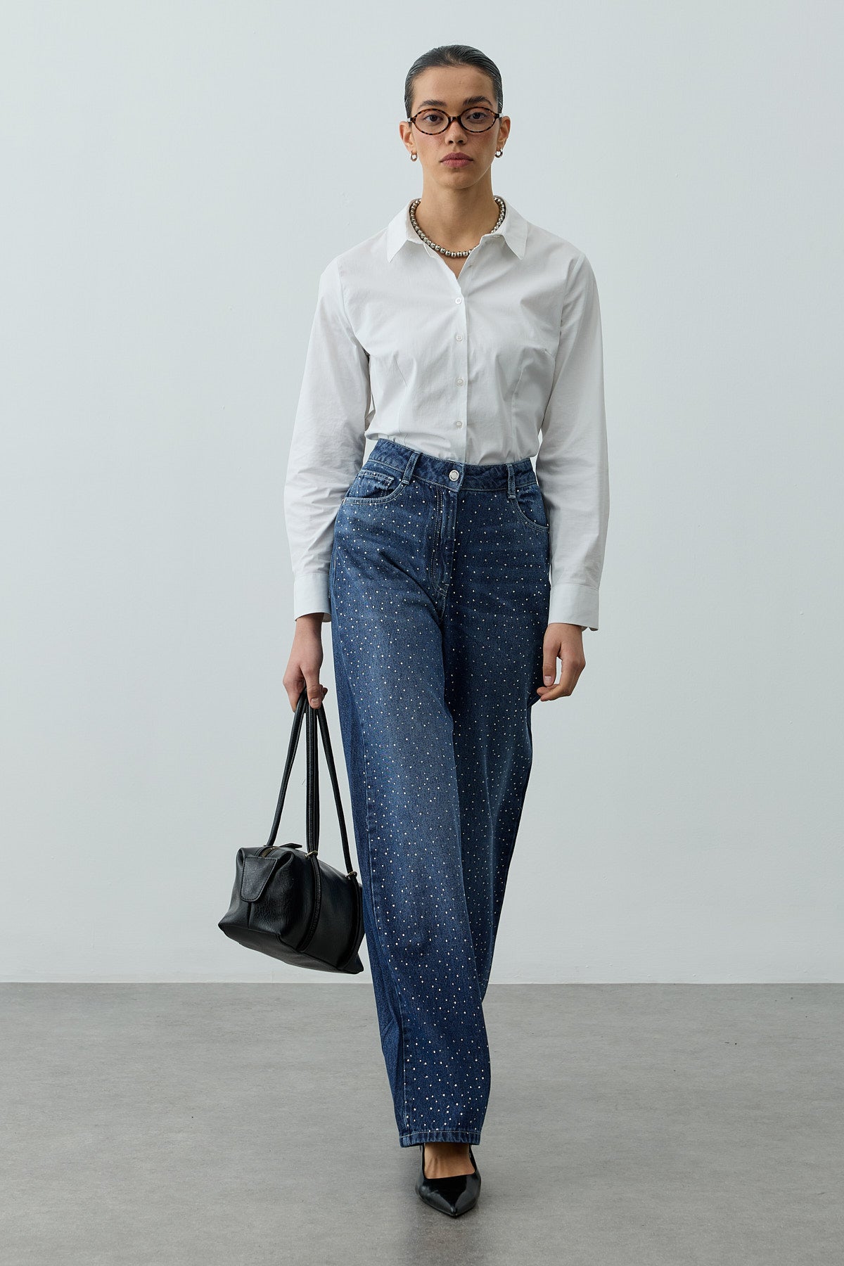 قماش دنيم منسوج، لامع، مرتفع الخصر، بحلقات حزام، بخمس جيوب، بسحاب وأزرار أمامية، جينز فضفاض مستقيم القصة.