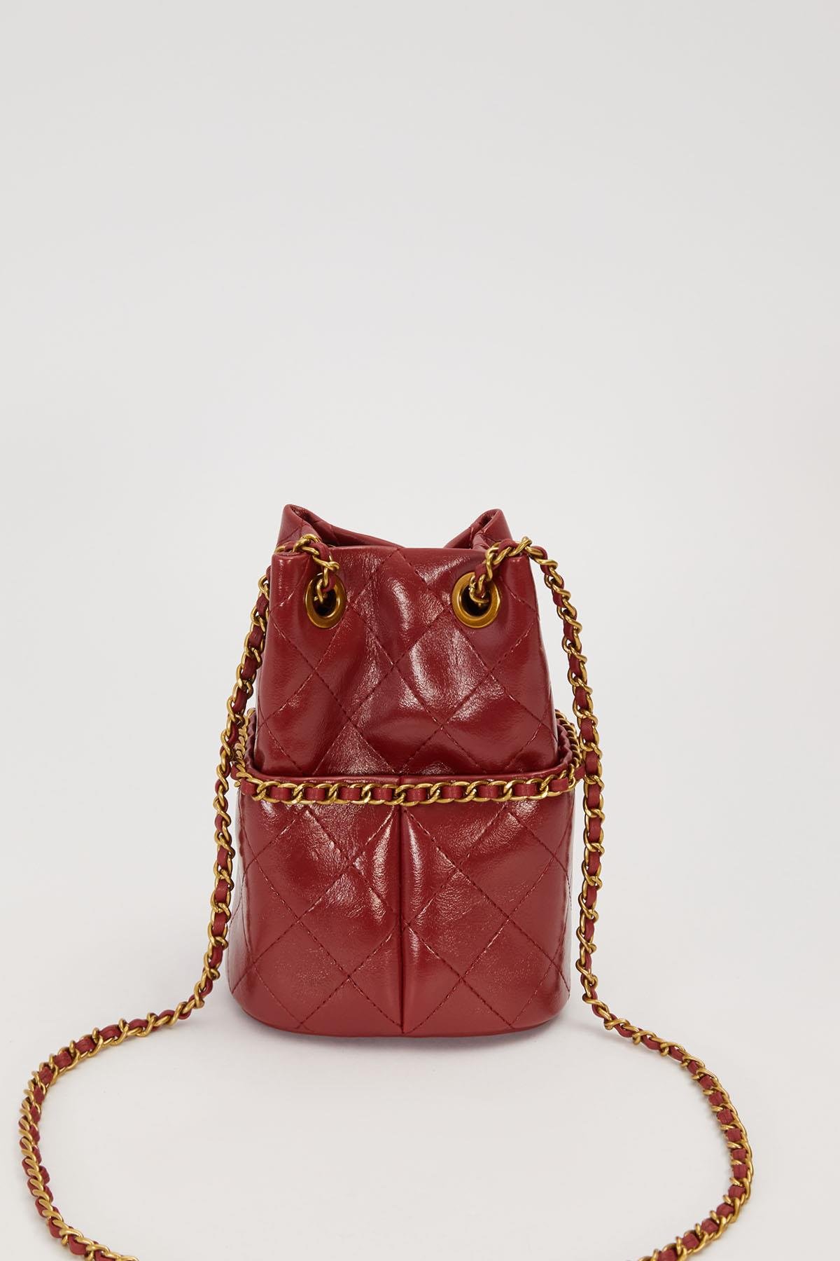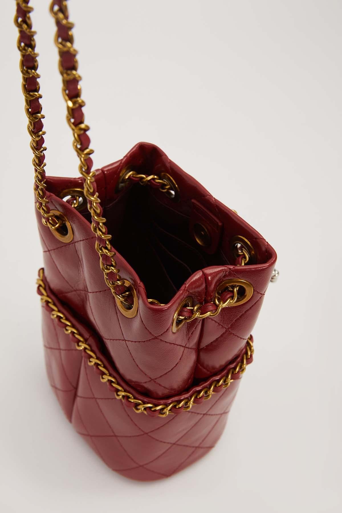 حقيبة كتف حمراء ذات قفل مزركش وسلسلة حمالة