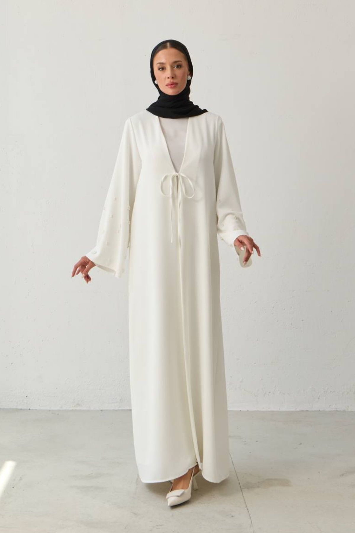 أناقة في كل زهرة. تدفق من الجمال الخالد… هذا العباءة المميزة مزينة بتطريز زهور تشبه اللؤلؤ على الأكمام. قماش الكريب الفاخر يتدفق بانسيابية على الجسم، يجمع بين الراحة طوال اليوم والأناقة. بقطعه البسيط وتفاصيل أكمامه الملفتة، زهرة اللؤلؤ تعبير بسيط لكن مؤثر عن الموضة المحتشمة العصرية.