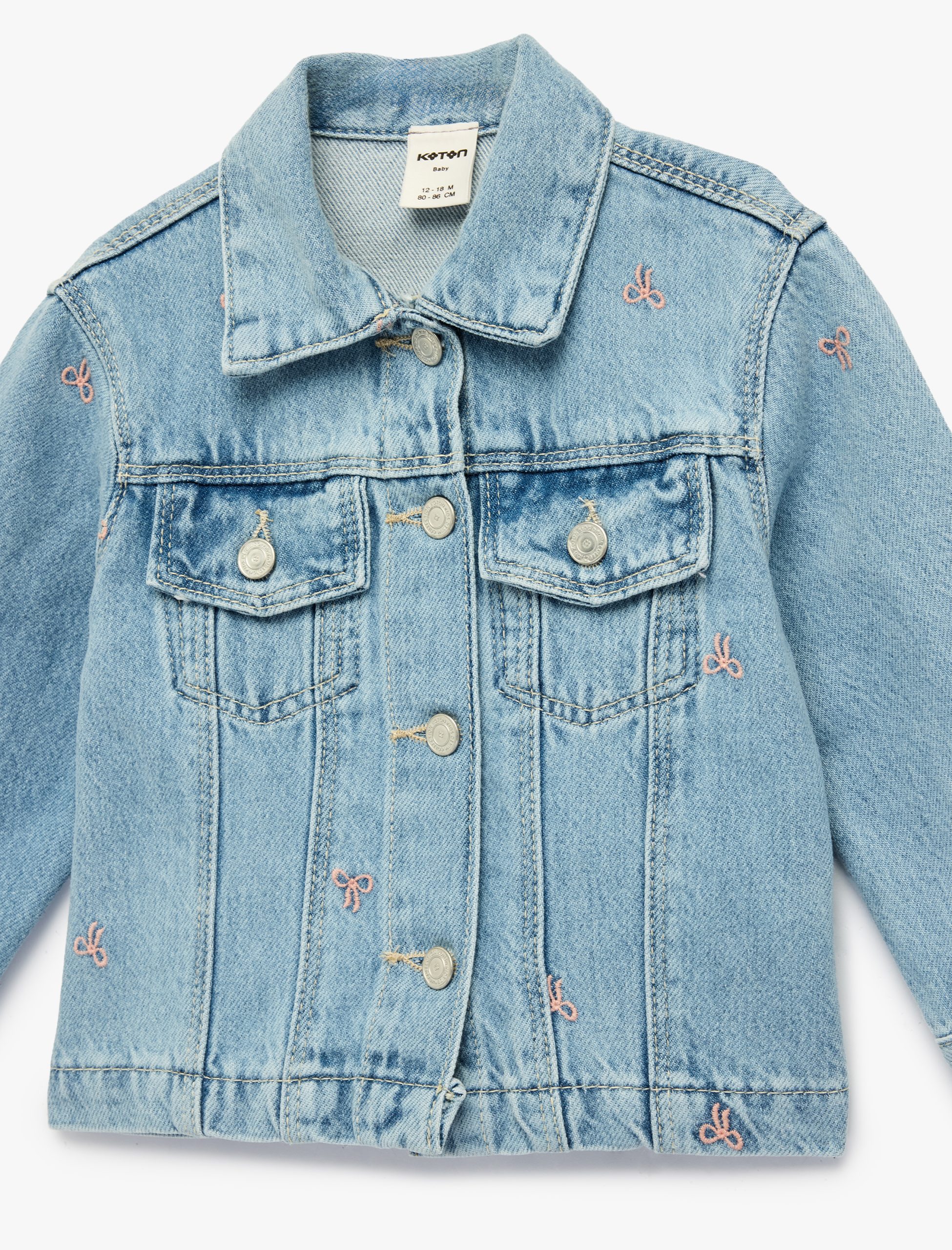 سترة الدنيم للفتيات ذات الأكمام الطويلة والمطرزة بالأشرطة ومزودة بجيوب