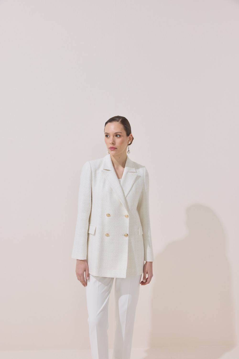 سترة بليزر مصنوعة من قماش التويد بلون الإكرو توفر مظهرًا أنيقًا وعصريًا.
