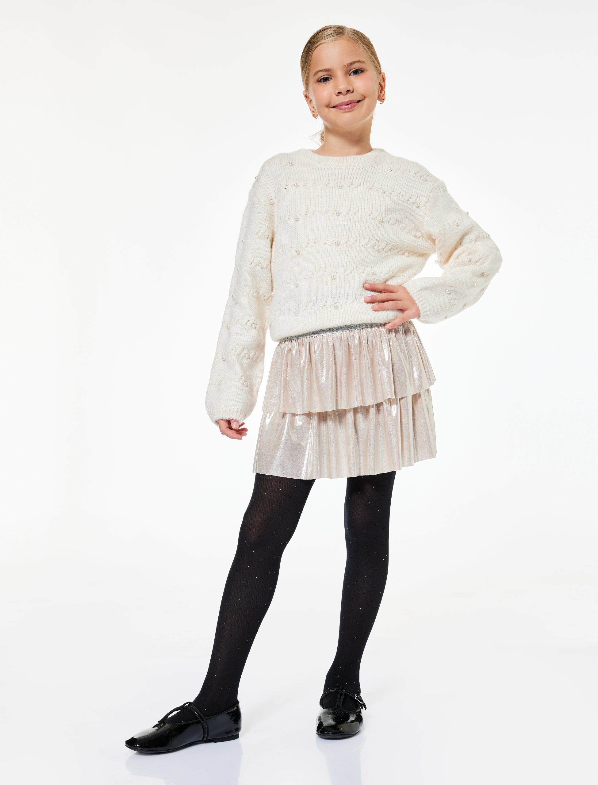 هذه السترة المحبوكة تضيف لمسة ساحرة إلى خزانة ملابس طفلتك. تتميز بأكمام طويلة وتصميم رقبة دائرية، معززة بتفاصيل خرز أنيقة تمنحها لمسة عصرية. نسيجها الناعم يسمح للأطفال بالحركة المريحة طوال اليوم.