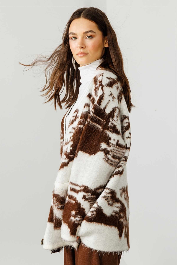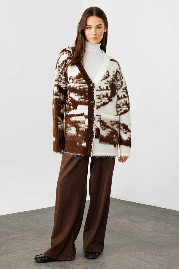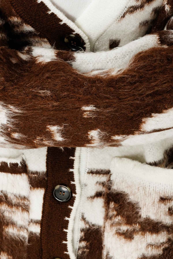 مصممة من خيوط خاصة مفرودة، تتميز السترة ذات النمط برقبة على شكل V، وتفاصيل حياكة دقيقة، وإغلاق بأزرار أمامية، وقصة واسعة.
