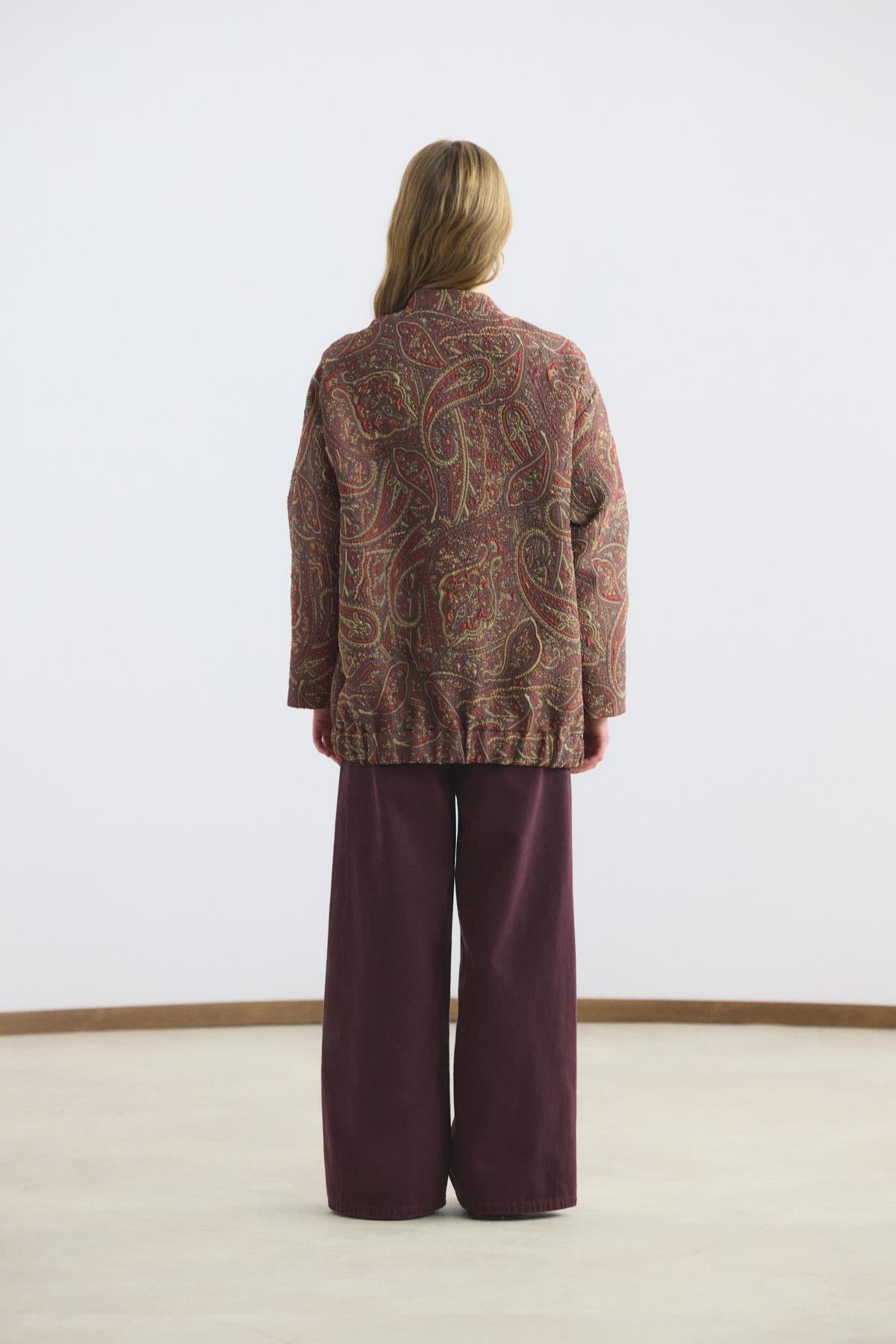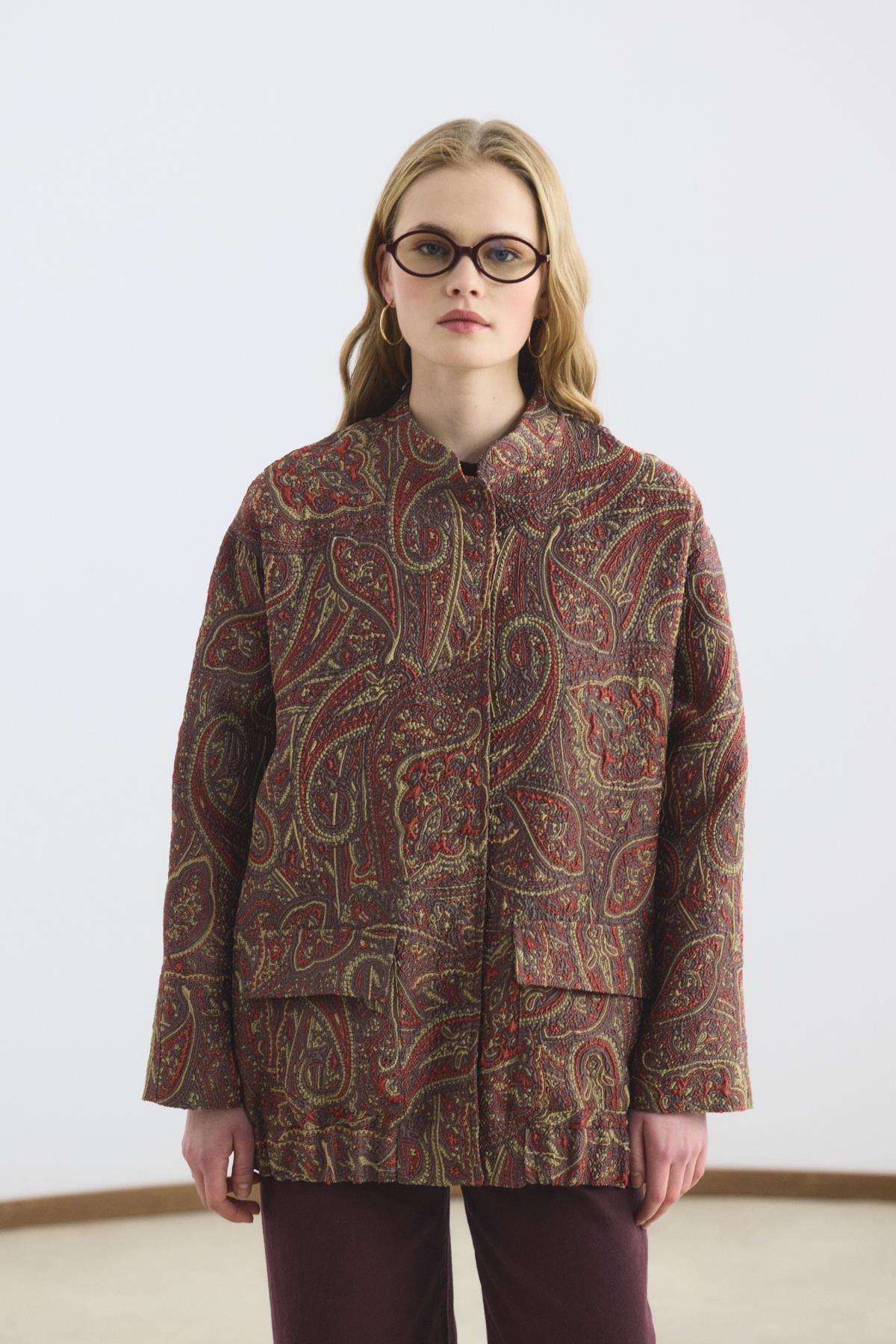 سترة بومبر جاكار بنية اللون مزخرفة، تضيف لشخصية أسلوبك قوة بفضل نسيجها الفريد وتصميمها المزخرف. تعطيها قطعة الياقة المستقيمة وتفاصيل الإغلاق المخفية بالزر شكلًا بسيطًا وعصريًا. يدعم الزوج المزدوج الذي يتكيف مع شكل الجسم بفضل الهيكل المطاطي في أسفل السترة سهولة الاستخدام مع جيوبه الجانبية الوظيفية.