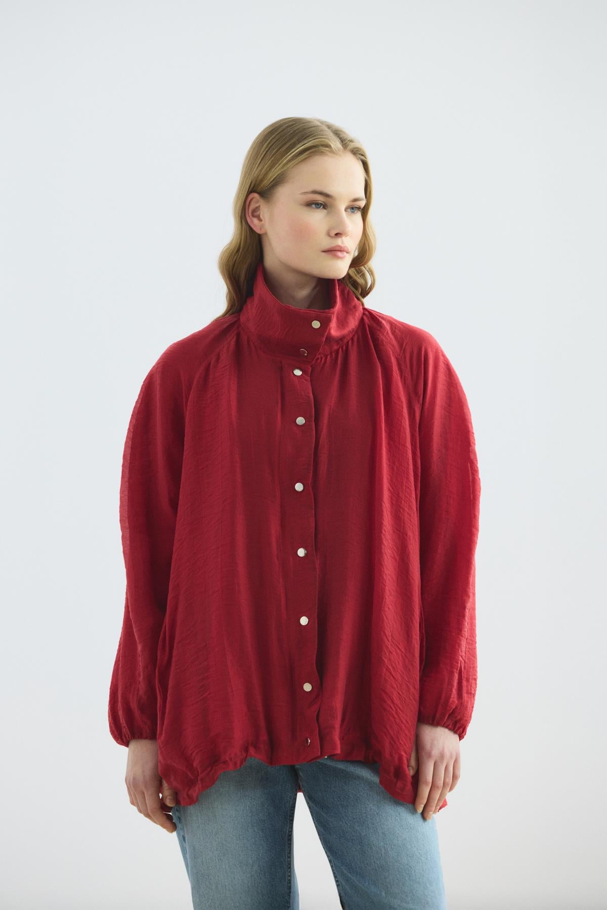 سترة بومبر حمراء ذات ياقة قائمة وطيات