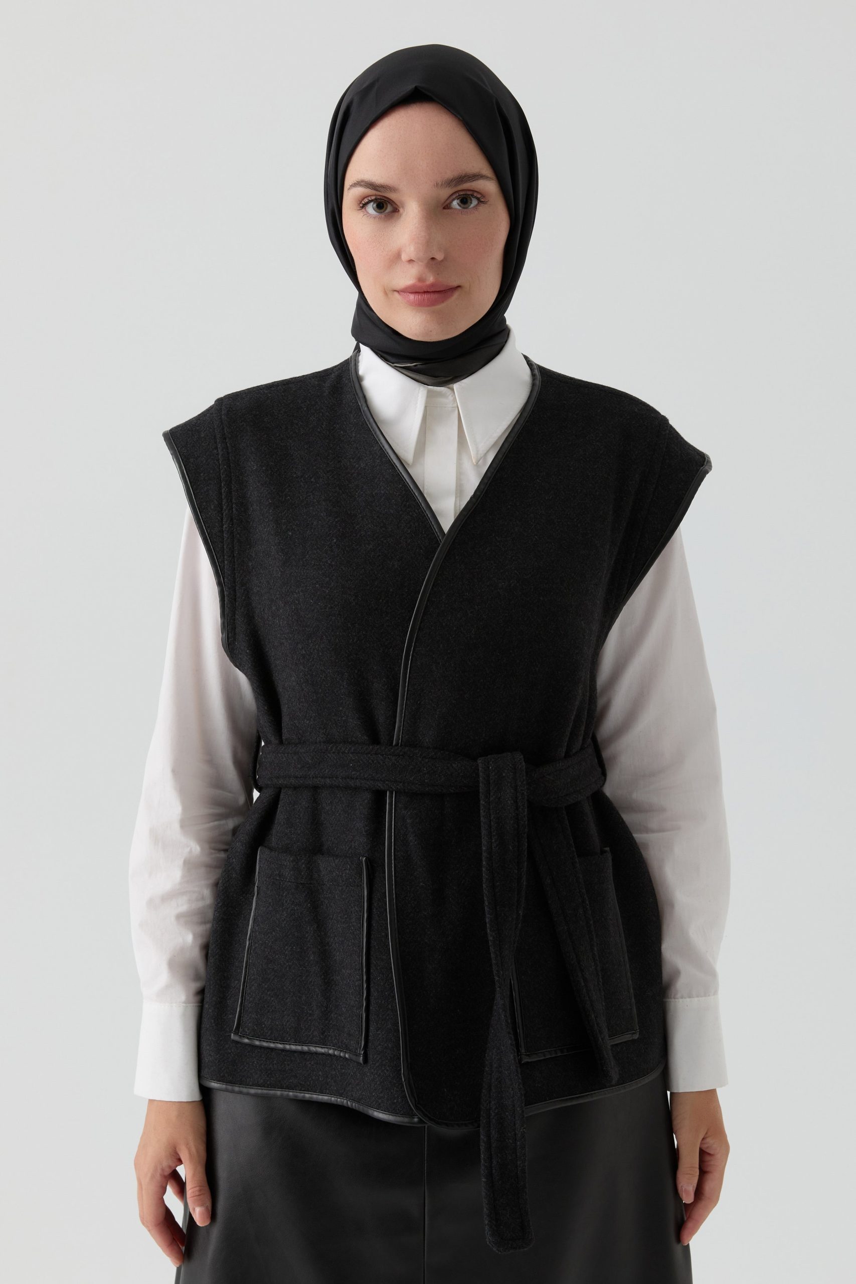 تتميز سترة الجيوب بتفاصيل الجلدية بخطوطها العصرية، وتقدم تصميمًا يجمع بين الوظيفية والأناقة. تعزز تفاصيل الجلدية مظهرها البسيط، مما يضيف لمسة راقية بينما توفر الجيوب جانبًا عمليًا.