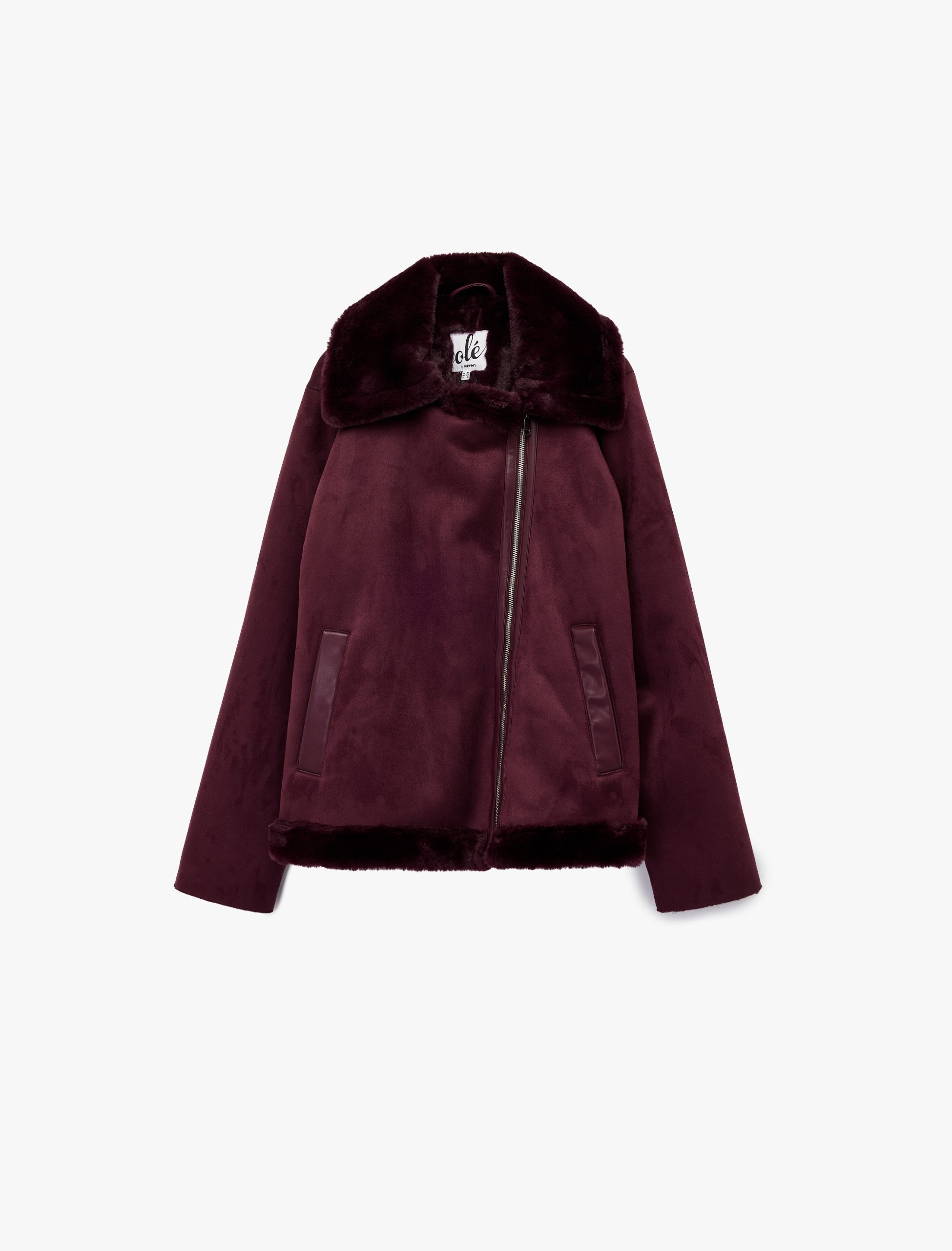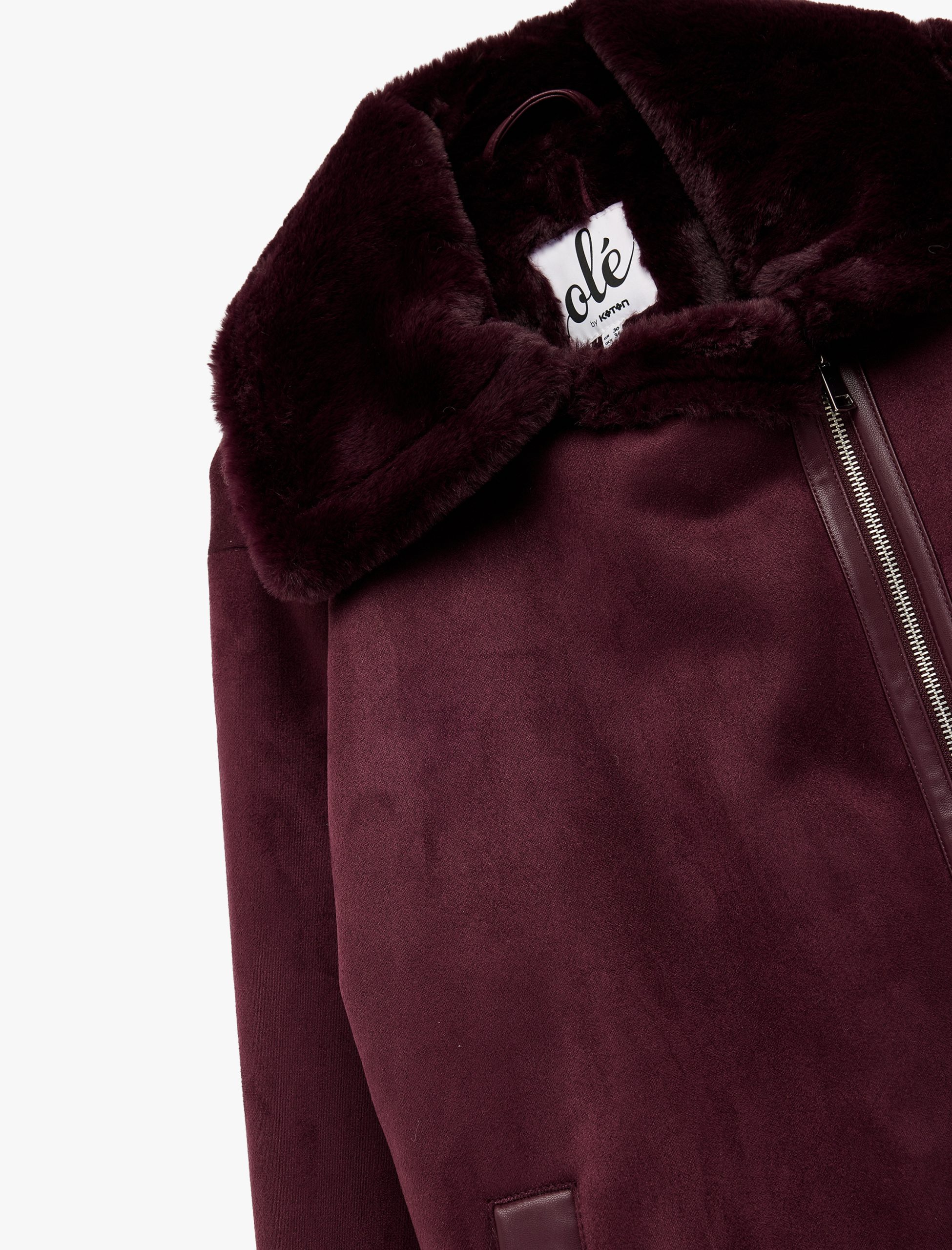 سترة دراجة نارية بمظهر جلد الغزال مع طوق فرو اصطناعي وسحاب