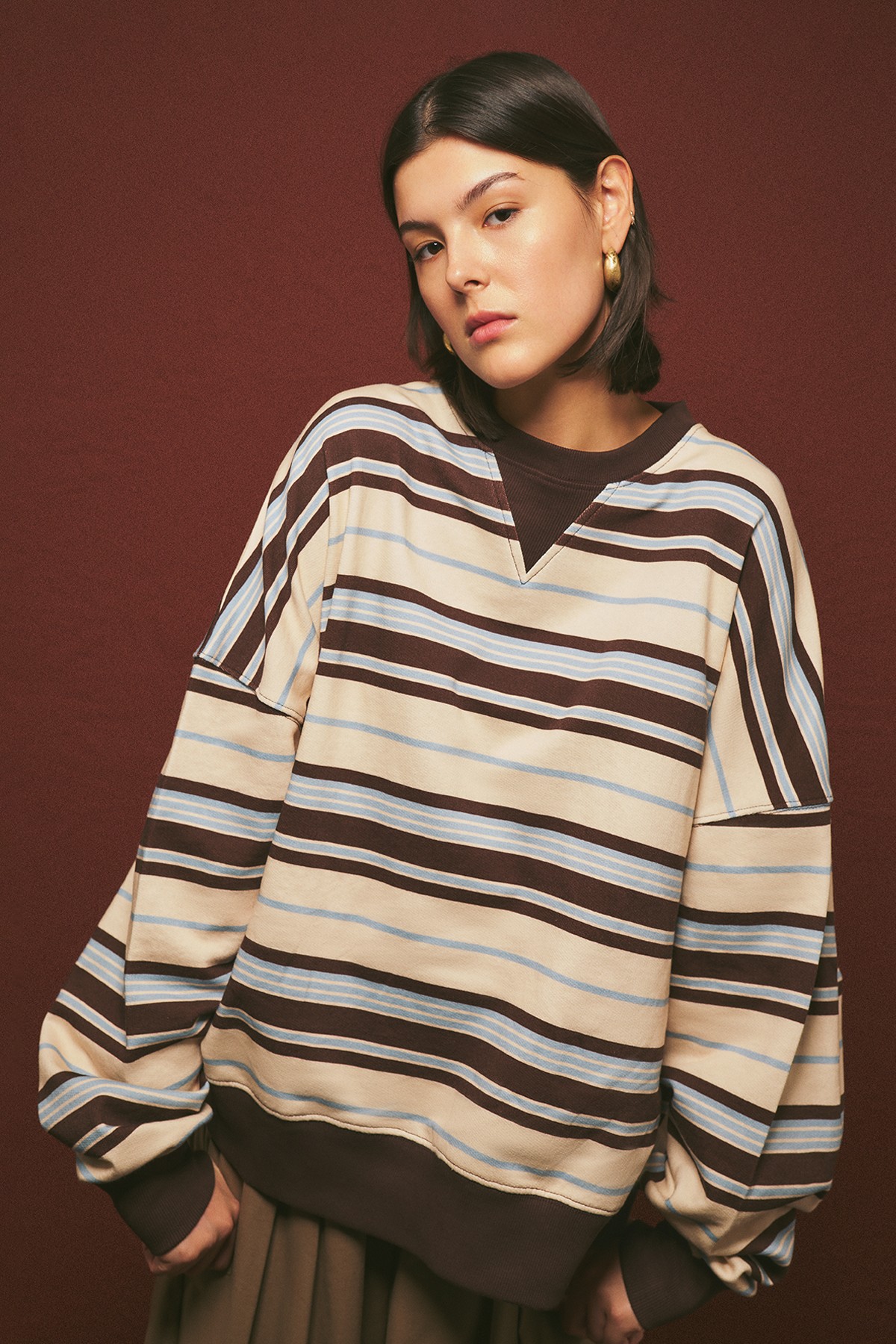 العلامات: Brown, comfortable, غير رسمي, قطن, كنزة, مخطط, واسعة
