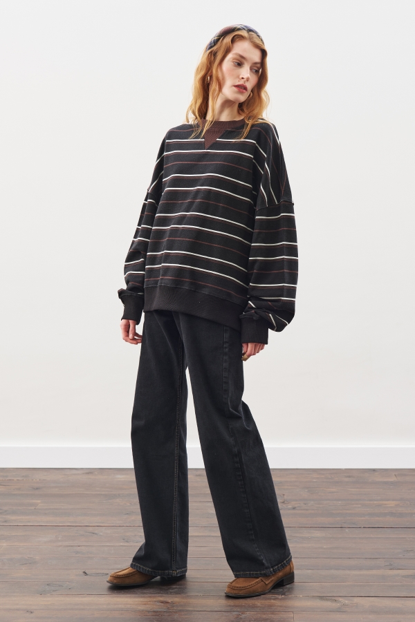 ياقة مستديرة، أكمام طويلة، قصة كبيرة الحجم.