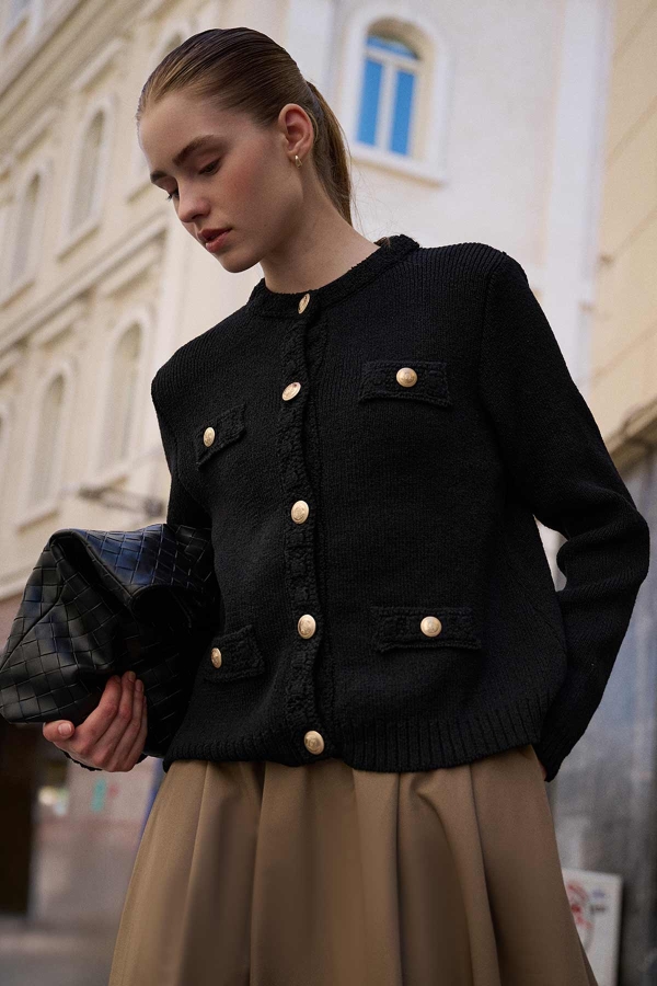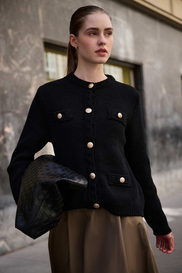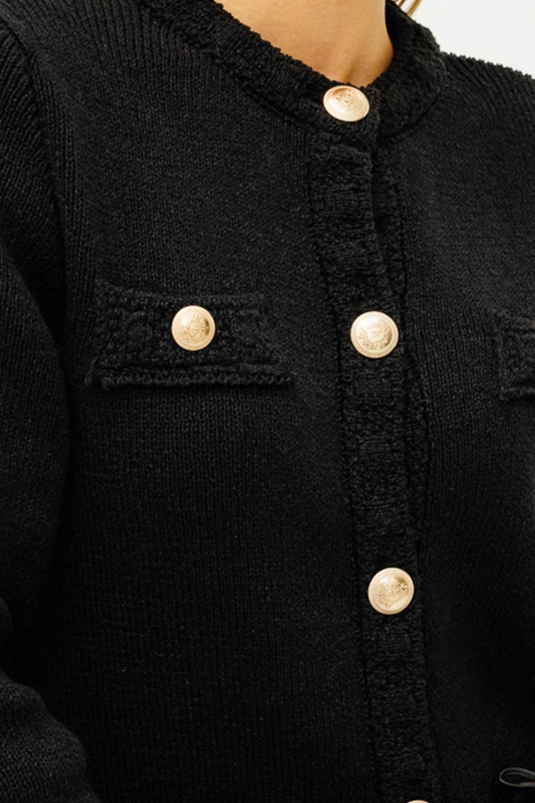 سترة منسوجة مصممة من خيوط البوكليه، تتميز برقبة مستديرة، وأكتاف متدلية، وأزرار ذهبية معدنية من الأمام، وجيوب زخرفية أمامية