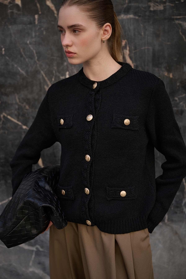سترة محبوكة برقبة مستديرة وأزرار أمامية وملمس ناعم.