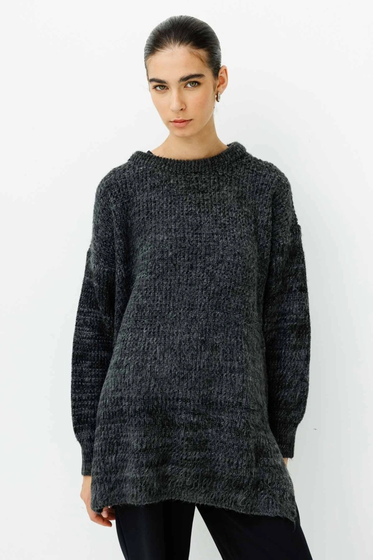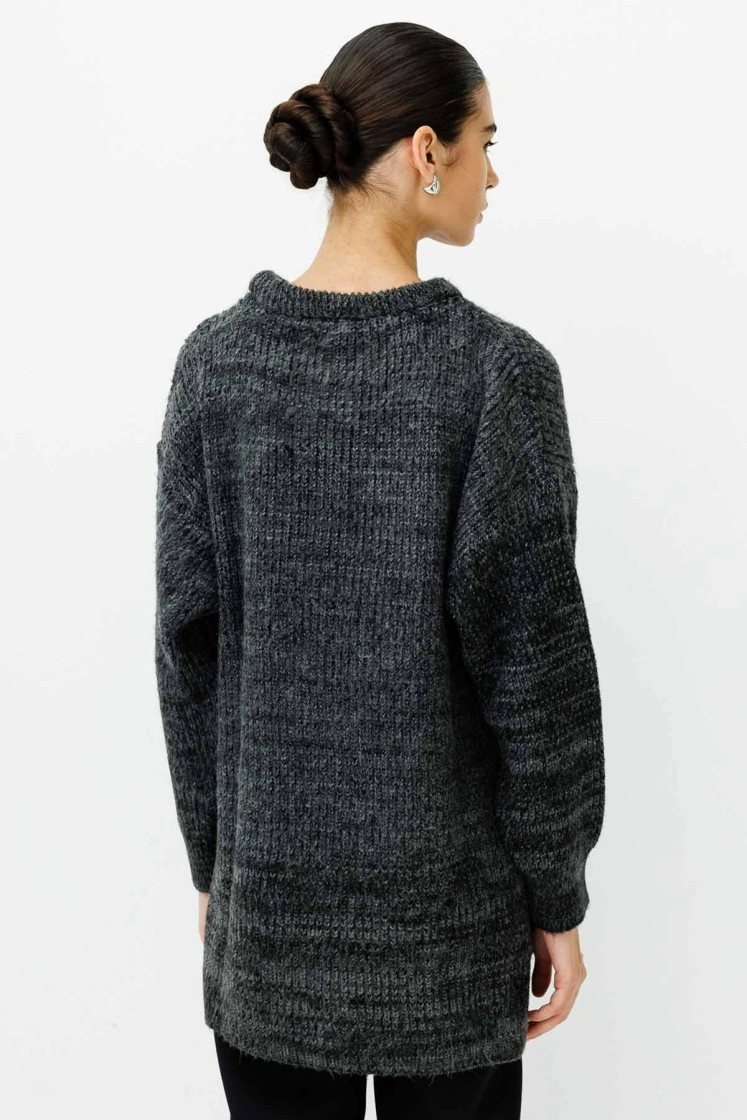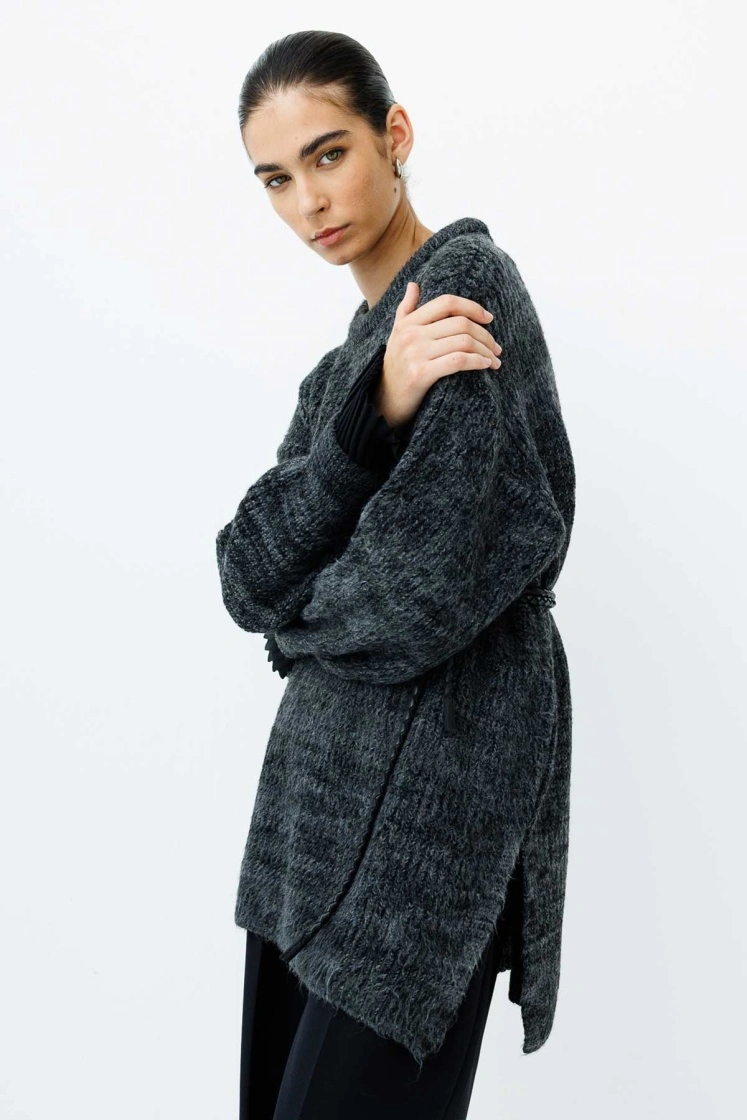 سترة صوفية بقطع مريح، مع ياقة دائرية وأكتاف منخفضة وفواصل جانبية.