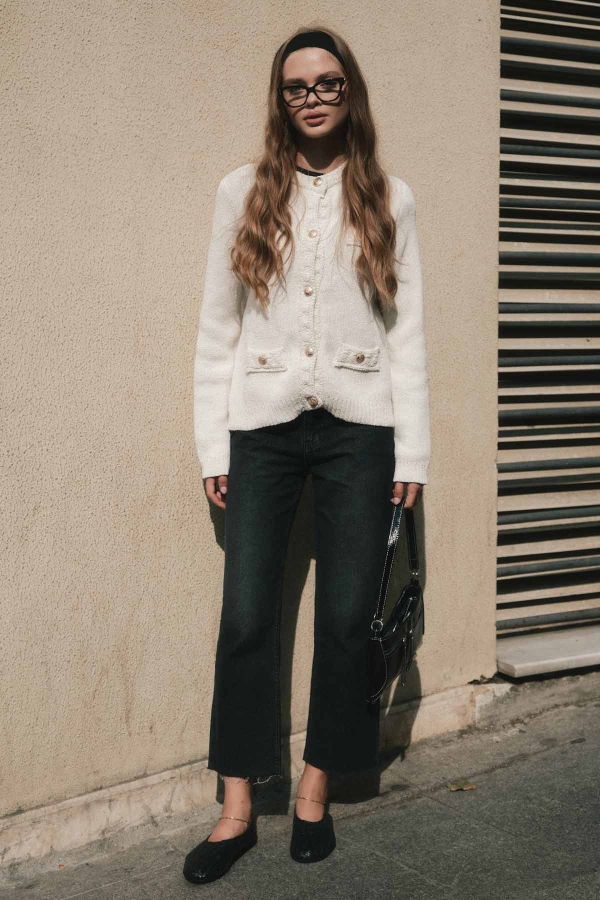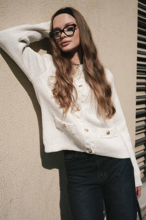 سترة محبوكة بقوام البوكليه مصممة من خيوط البوكليه برقبة دائرية وأكتاف متدلية وأزرار ذهبية معدنية من الأمام وجيوب زخرفية أمامية