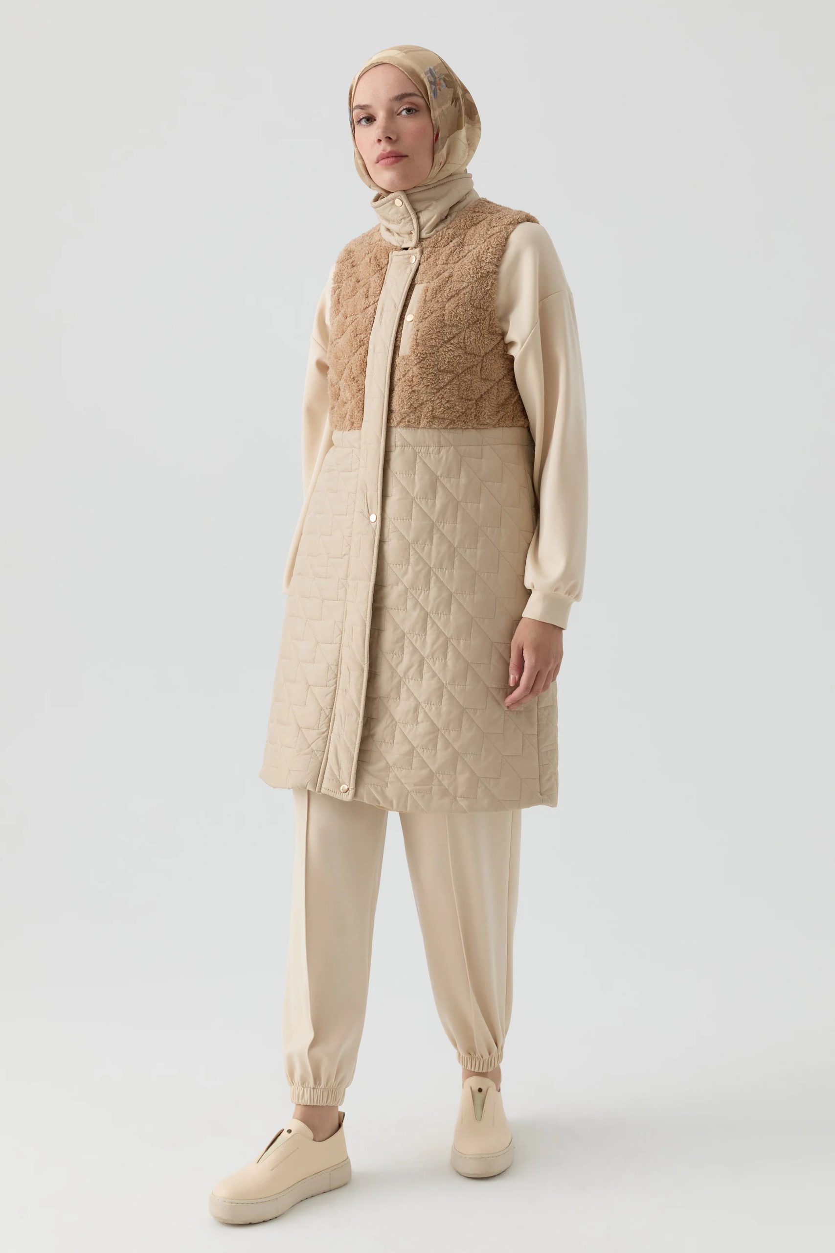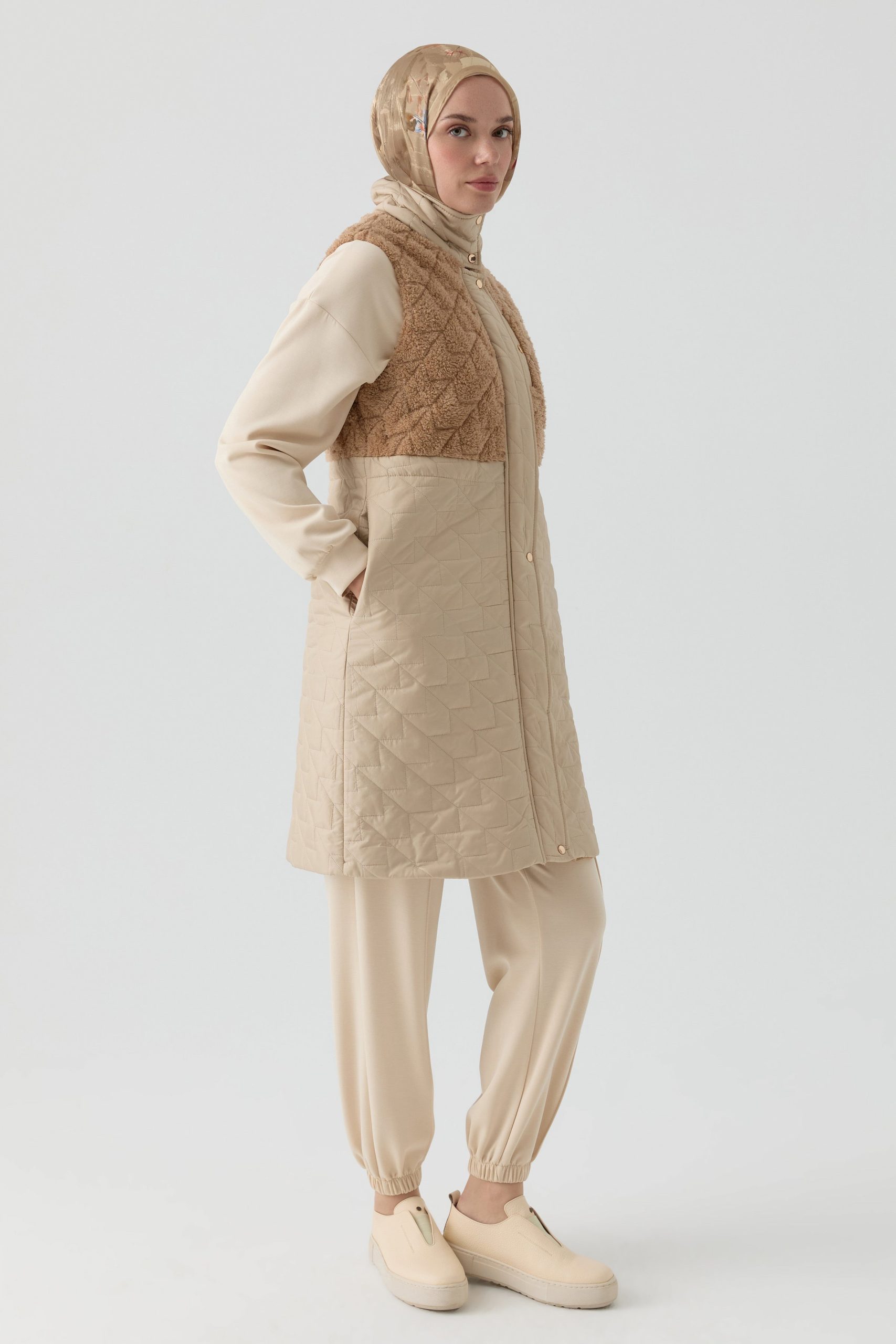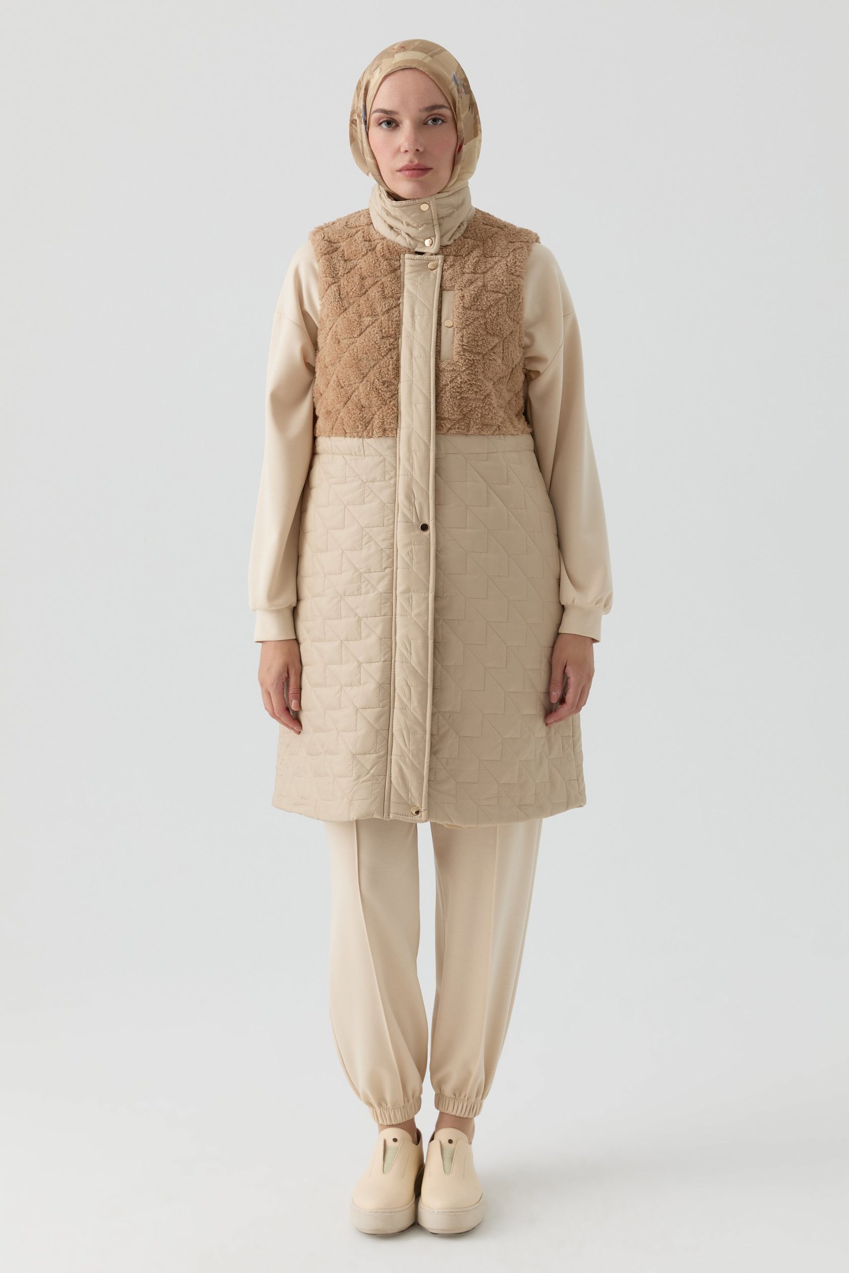 سترة مبطنة مطرزة بتفاصيل فرو صناعي – بيج