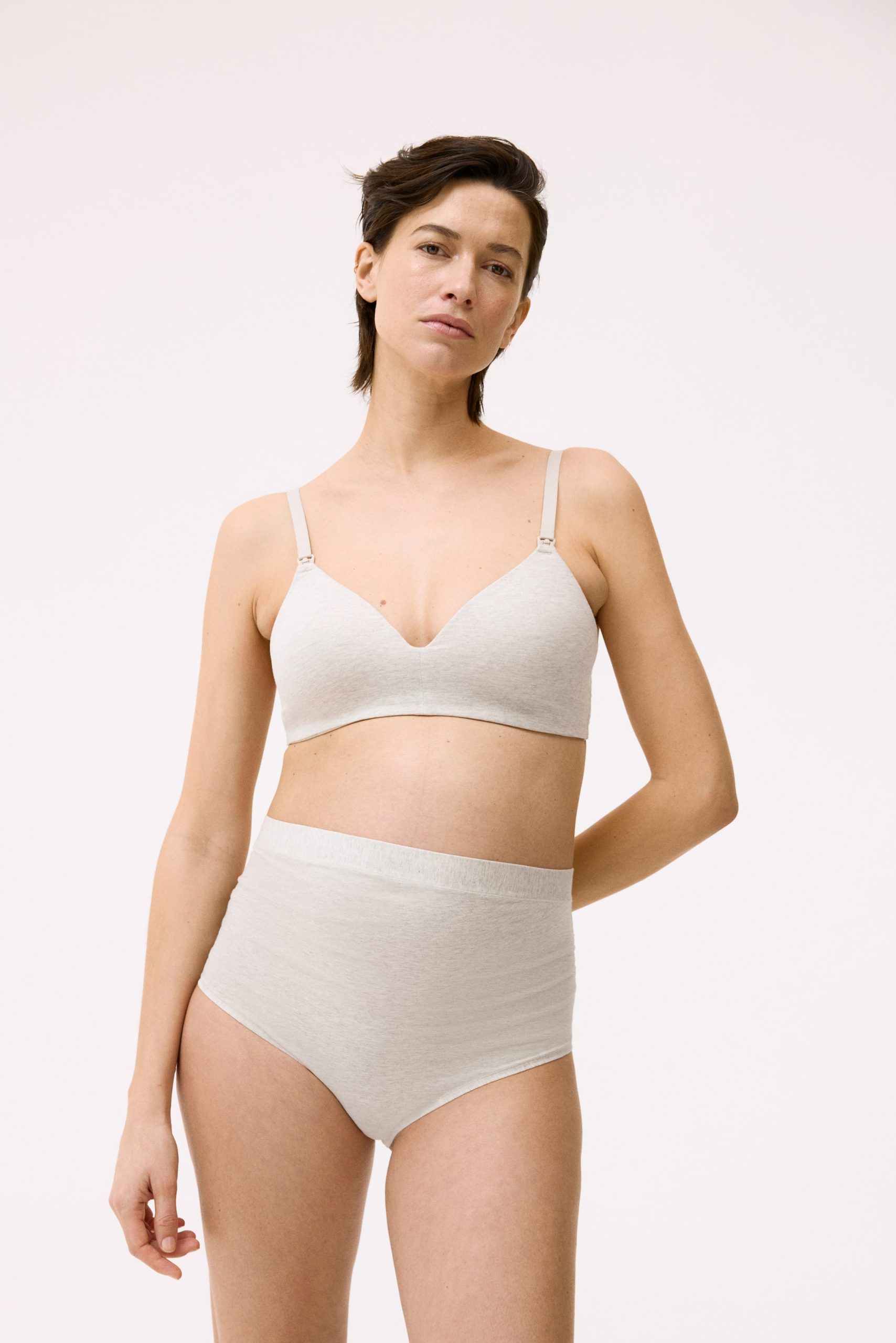 سروال داخلي عالي الخصر مصنوع من قماش الجيرس القطني الناعم، مع تجميعات جانبية لتناسب الخصر بشكل مثالي. مزود ببطانة أمامية وقطع خلفي ضيق.