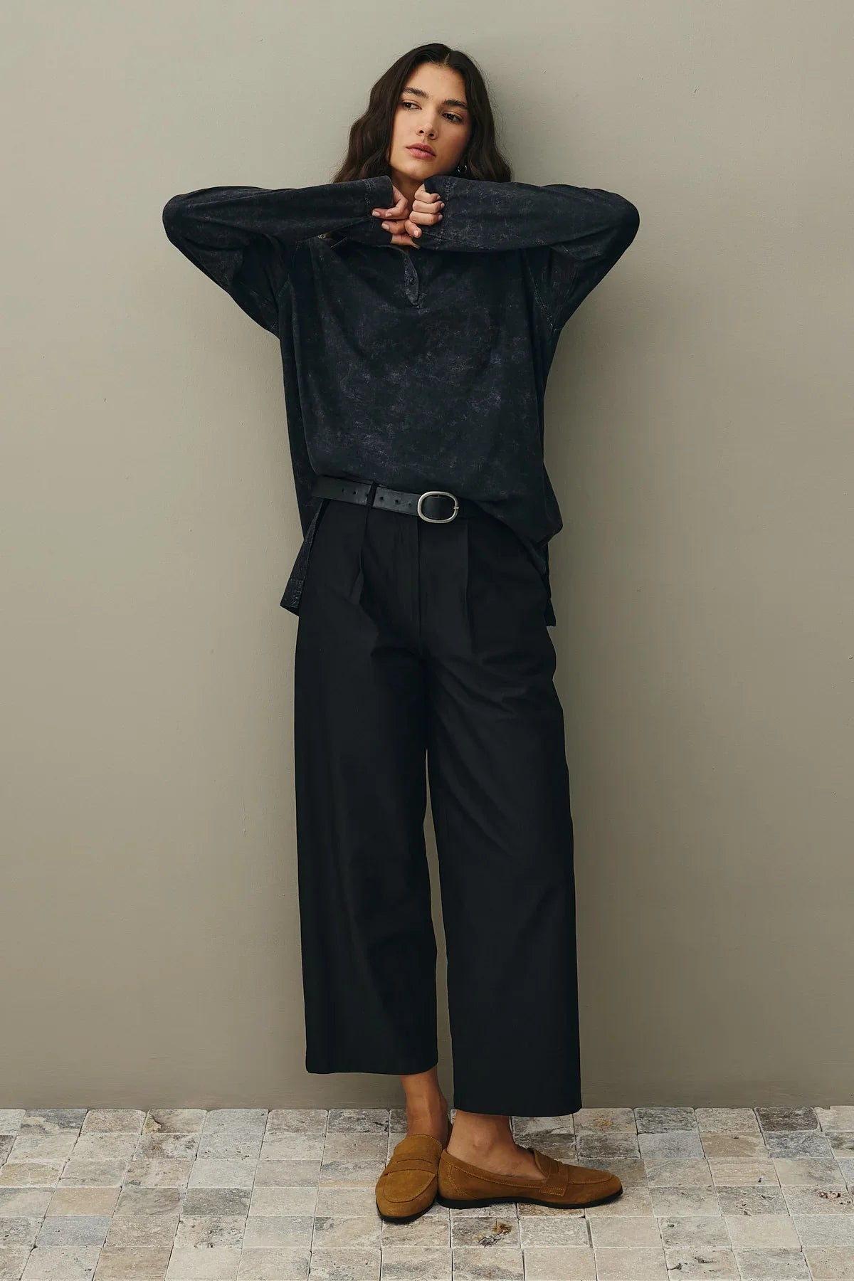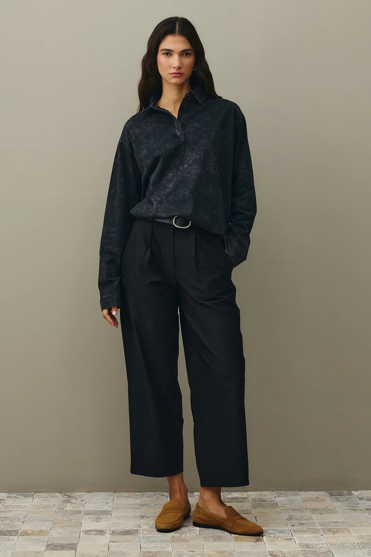 مصنوع من نسيج قطني محبوك بنسبة 100%، يتميز هذا السويت شيرت بياقة بولو بأزرار أمامية، تأثير مغسول، تفاصيل شق جانبي، وأكمام طويلة لملاءمة مريحة.