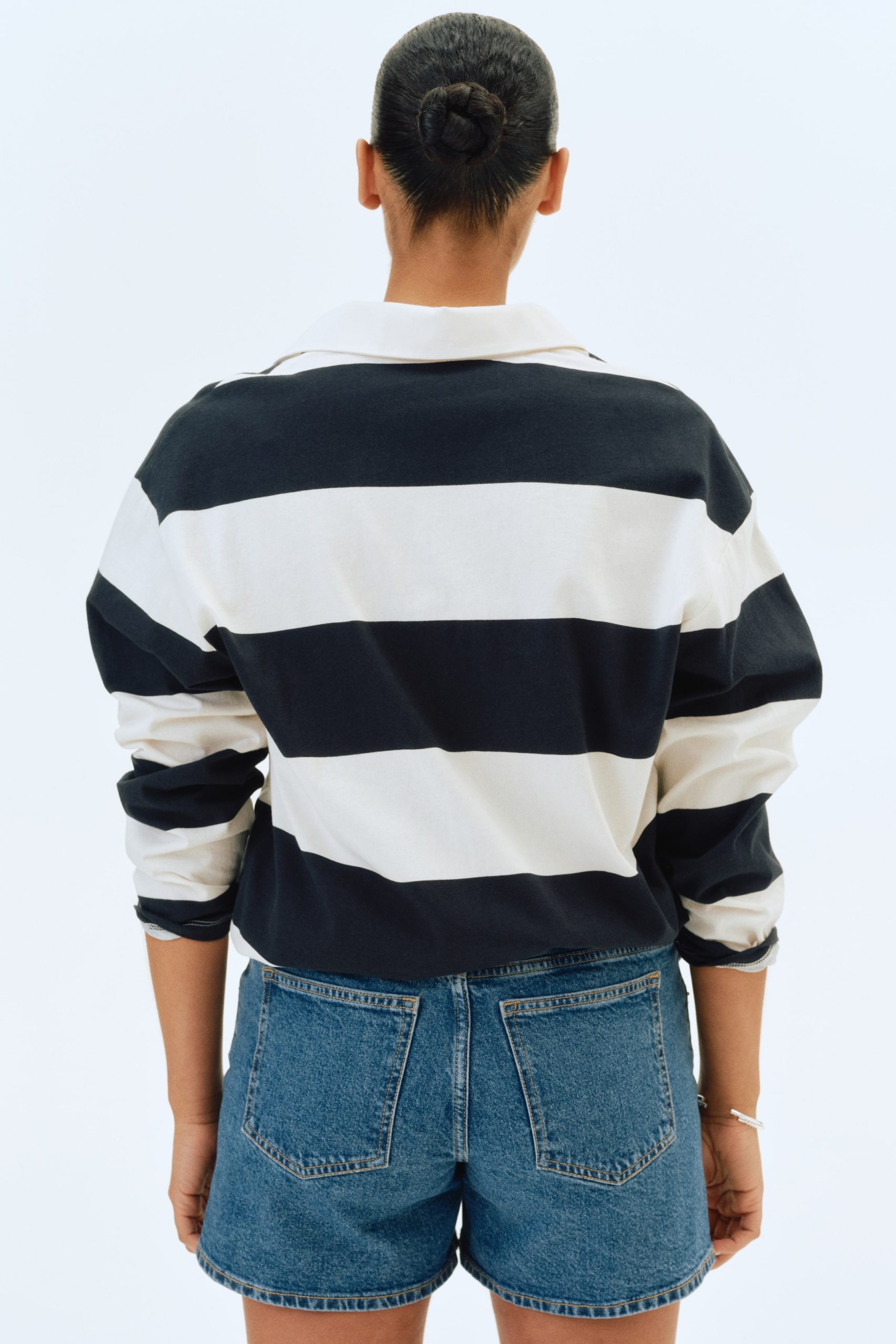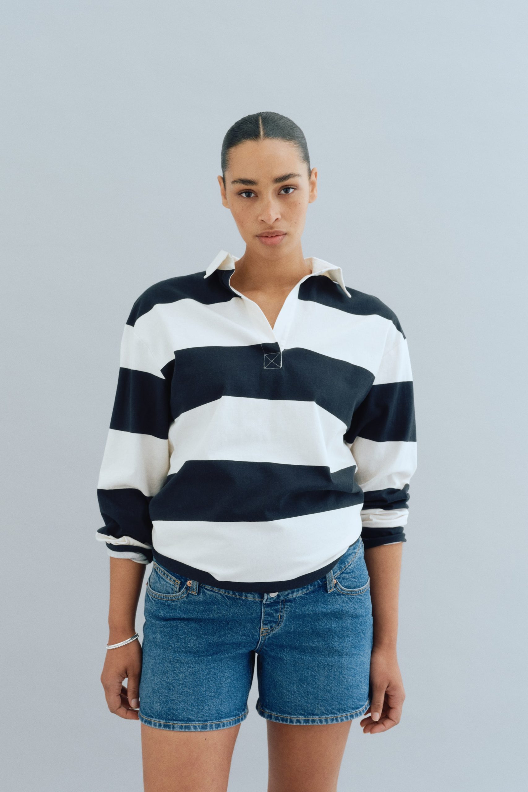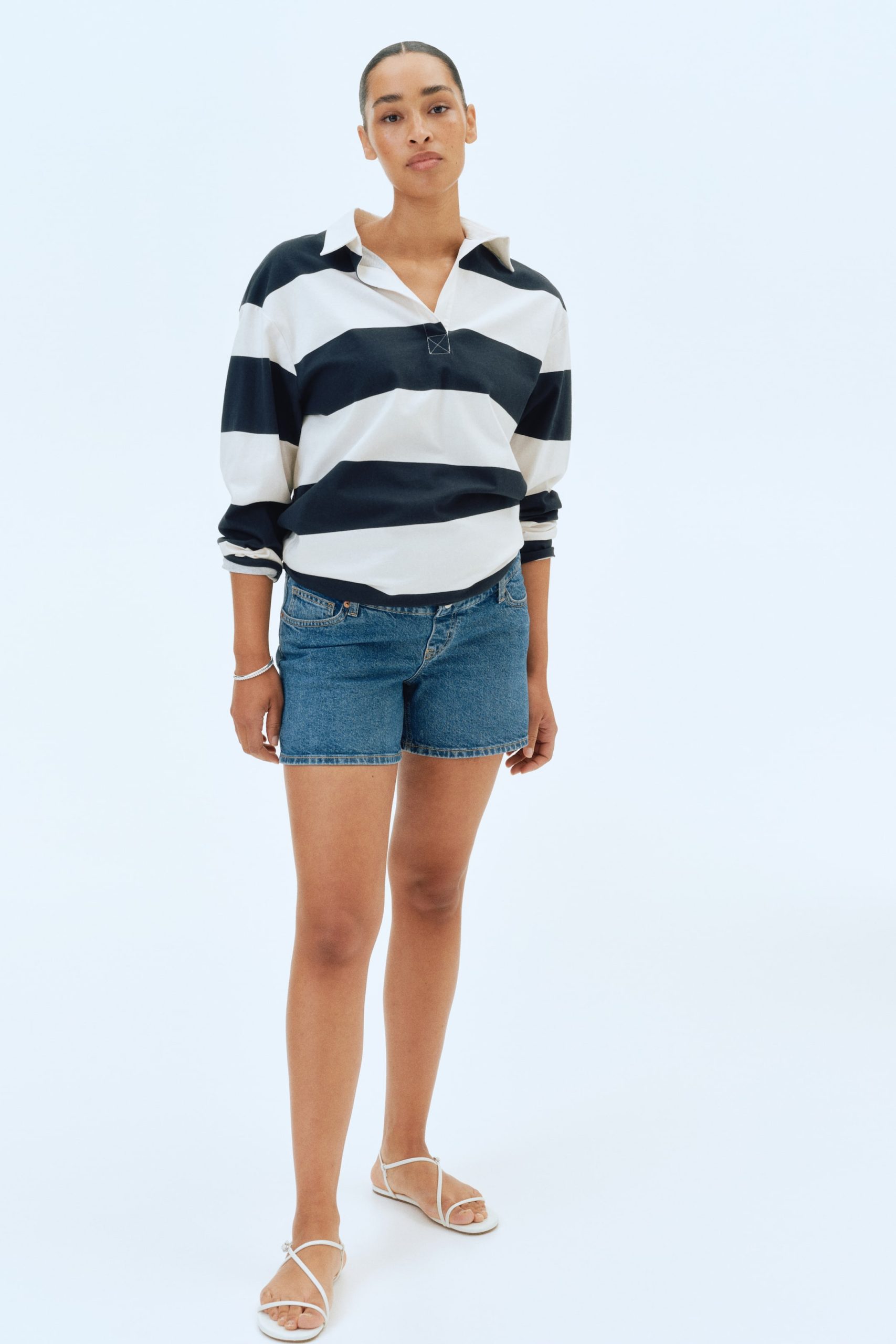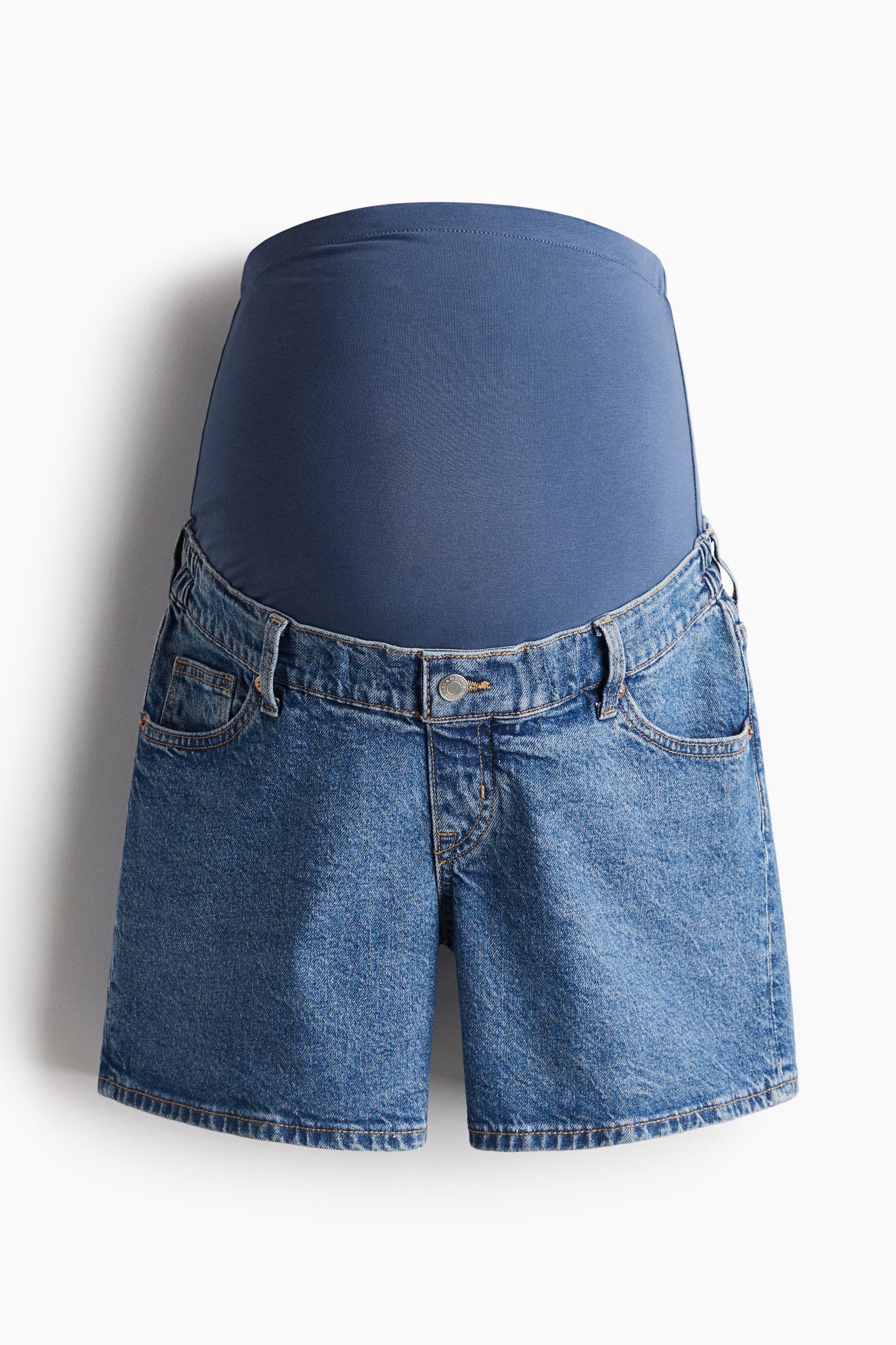 شورت مصنوع من قماش الدينيم القطني، مزود بـ5 جيوب، مع أشرطة مطاطية مغطاة على الجانبين، ولوحة من قماش الجيرسي عريضة عند الخصر لتناسب البطن بشكل مثالي.