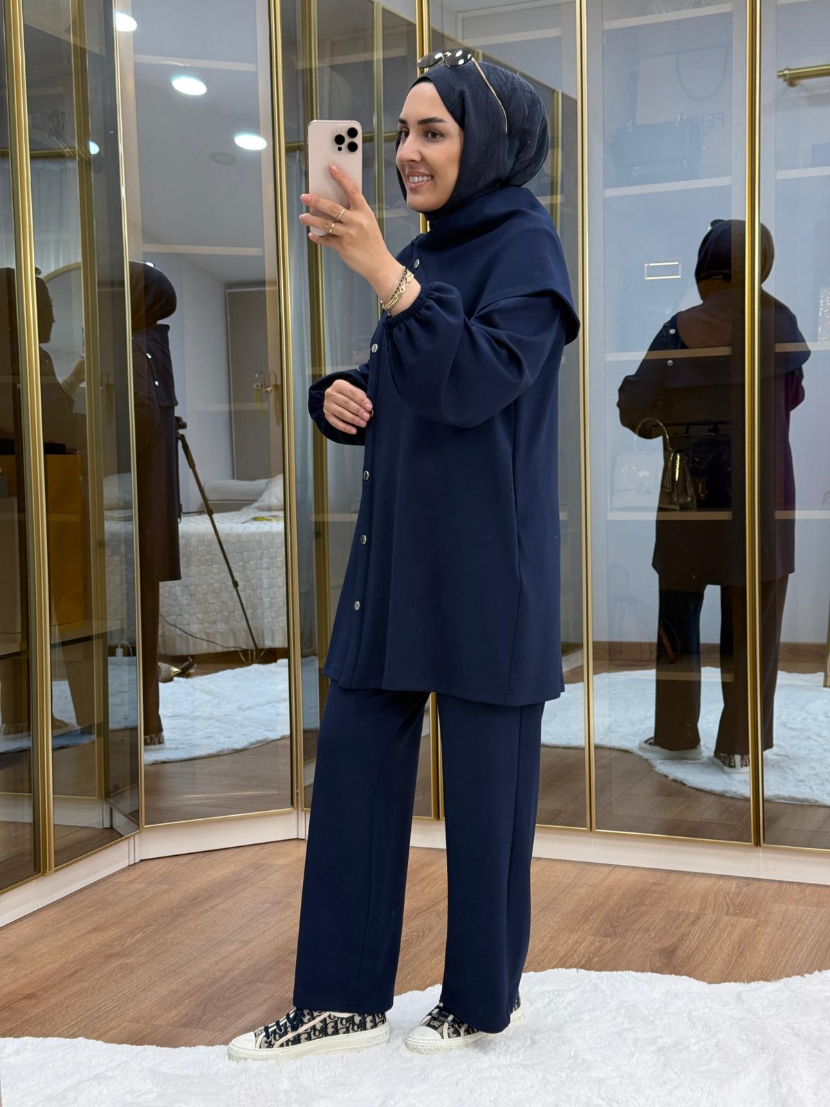 طقم أزرق بحري بتفاصيل أزرار معدنية غير متماثلة