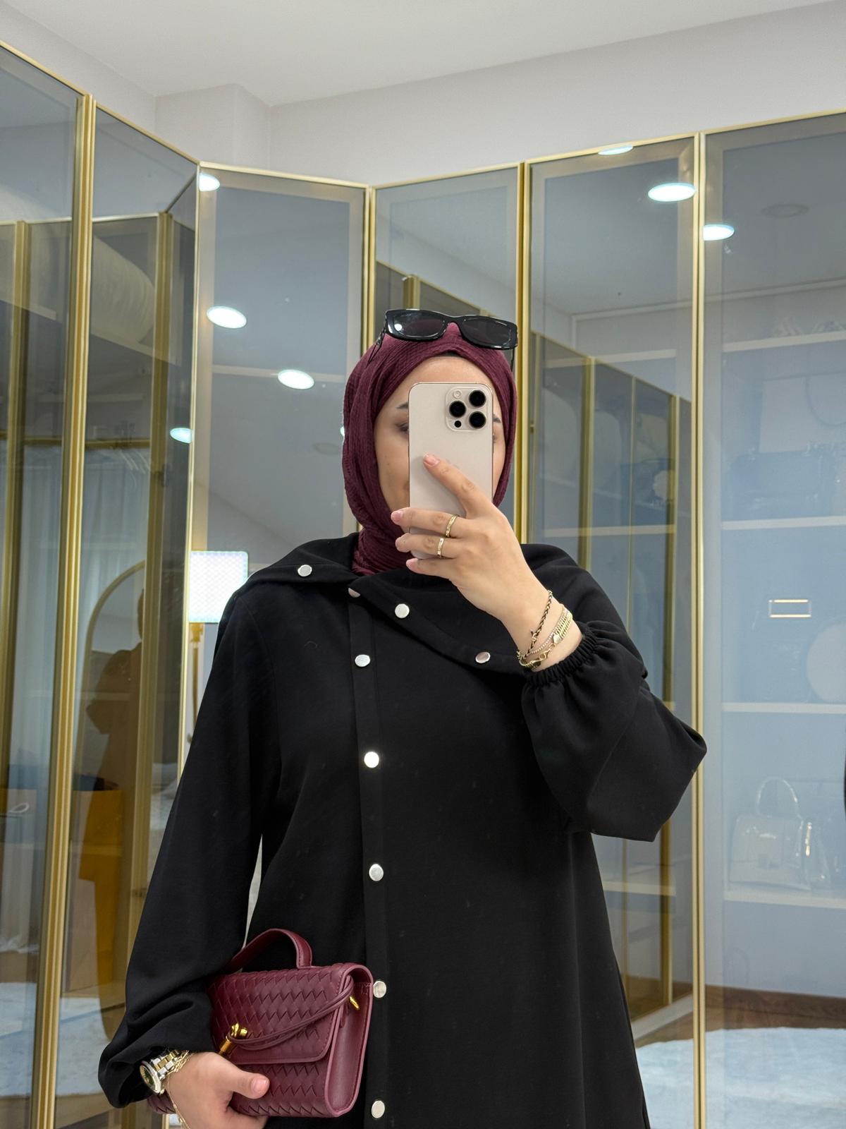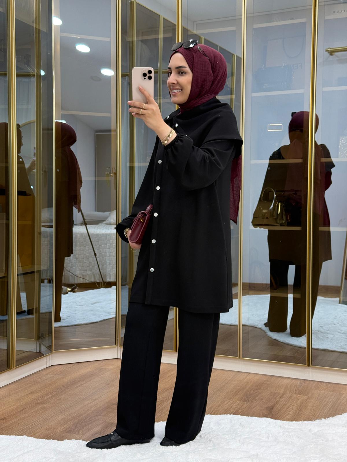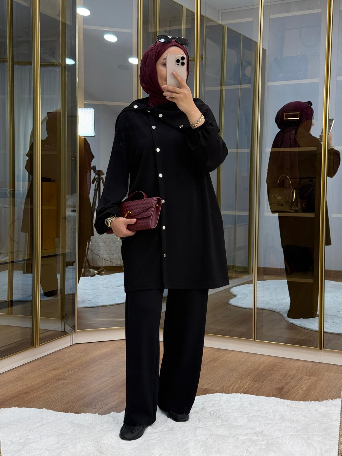 طقم أسود بتفاصيل أزرار معدنية غير متماثلة • الألوان | •أزرق بحري، بني، أسود، برقوقي، بيج، رمادي دخاني • المقاس 1: 38/40/42 • المقاس 2: 44/46 • المقاس 3: 48/50 • المقاس 4: 52/54/56 • مصنوع من قماش أويشو الممتاز • طول التنورة: 85 سم • مزود بجيوب جانبية • يشمل حزاماً قابلاً للفصل • طول البنطلون: 105 سم