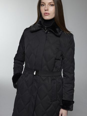 معطف أسود مبطن بزخرفة فرو على الياقة والأكمام 13960