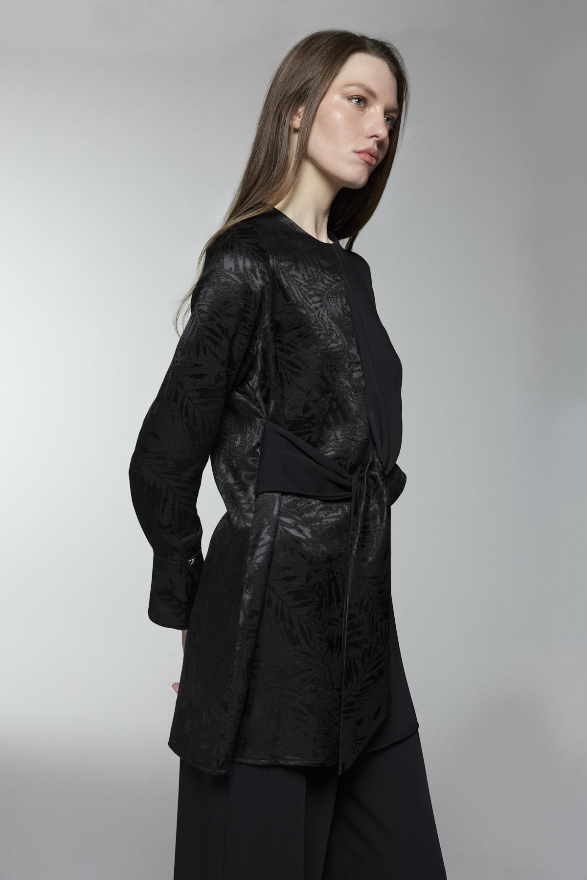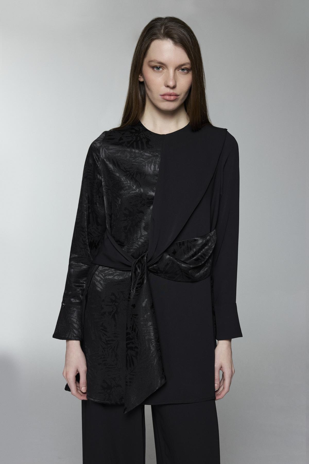 طقم أسود ثنائي القطعة مزود بحزام مع تصميم متدرج غير متماثل TK-1687